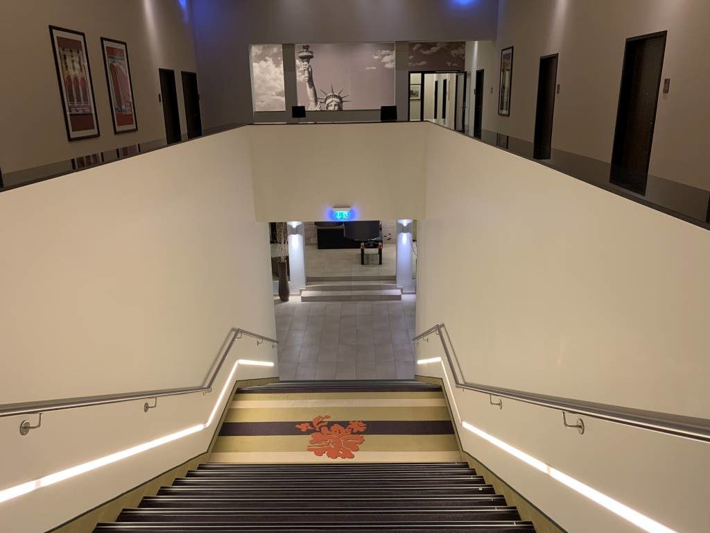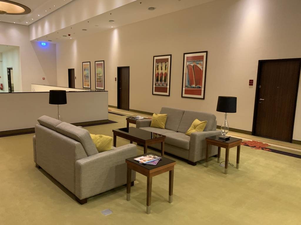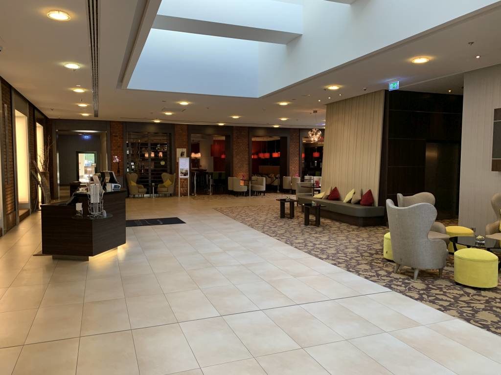 Schon der Parkplatz war gähnend leer. Nicht anders war es dann auch, als mir die Mitarbeiterin an der Rezeption die Tür zum Hotel öffnete. Die Lobby war komplett verwaist. Dementsprechend konnte ich auch ohne Wartezeit einchecken. Spannend, dass es keinerlei Sicherheitsvorkehrungen gab. Weder war die Rezeption durch eine Plexiglasscheibe vom Gast getrennt, noch trugen die Mitarbeiter Mundschutz oder Handschuhe.