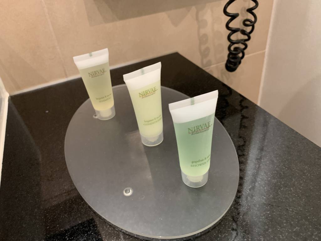 Das geräumige Bad wirkte irgendwie zu groß. Zwar verfügte es neben dem Waschtisch und der Toilette über eine Badewanne, doch die Größe des Raumes wirkte irgendwie verschenkt. Auf dem Waschtisch standen ein paar Basic-Pflegeprodukte der Marke NIRVAE botanicals bereit.