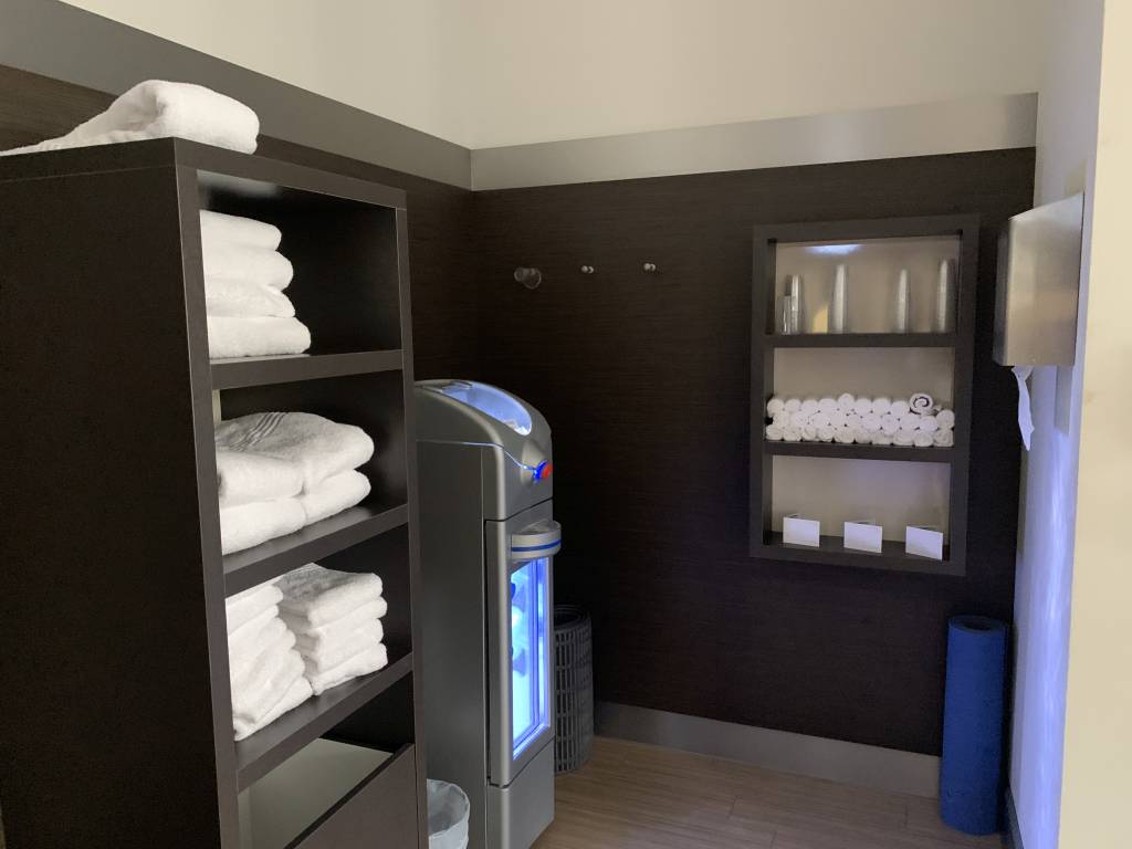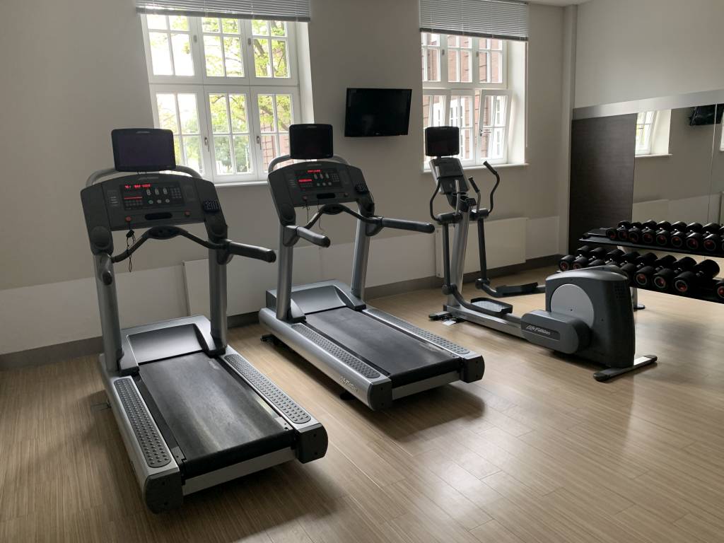 Der kleine Fitness-Bereich verfügt über zwei Laufbänder und einen Stepper. Dazu gibt es noch einige Hanteln. Zudem könnt Ihr Euch hier mit Trinkwasser versorgen und auch genügend Handtücher lagen bereit. Lediglich Desinfektionsmittel fehlte.