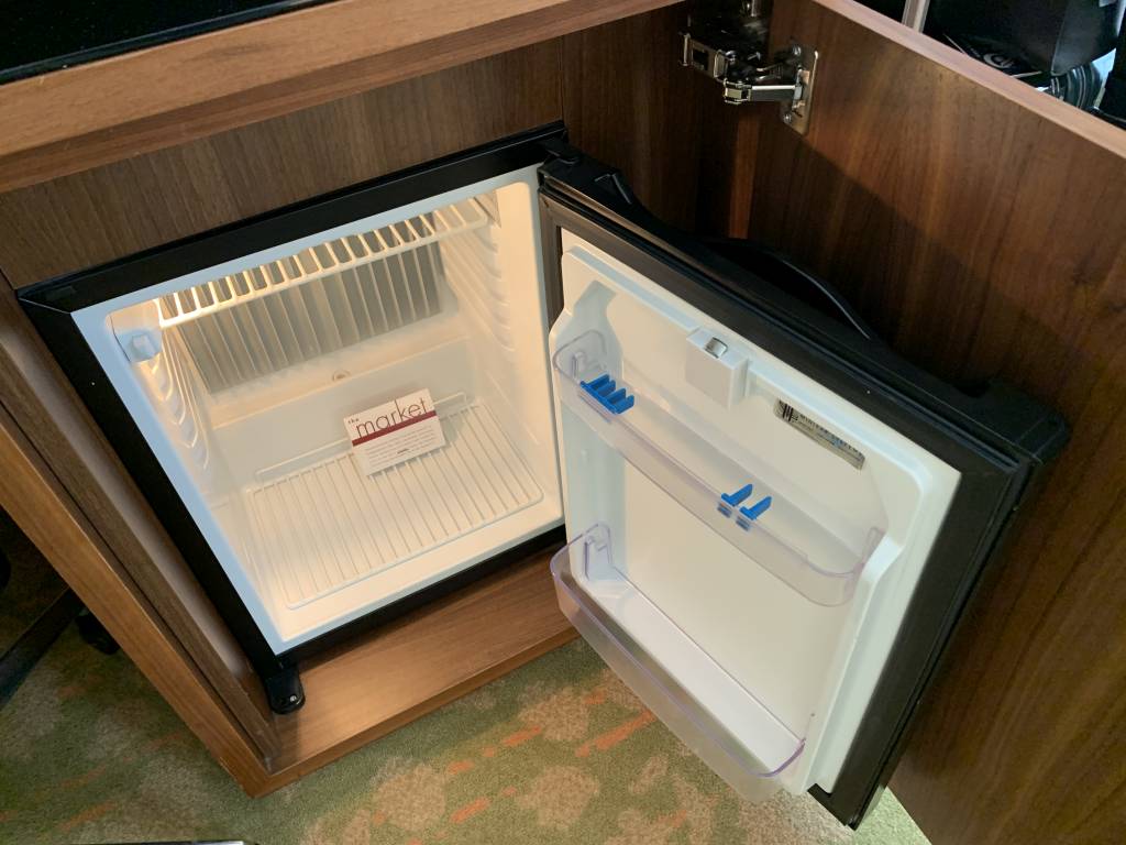 Mein Komfort-Zimmer mit King-Bett war etwa 30 qm groß. Es verfügte zusätzlich über einen Schreibtisch und zwei Sessel mit kleinem Esstisch. Über dem Schreibtisch befand sich auch ein Flachbildfernseher und hinter einer der Schranktüren der Kühlschrank. Letzter war nicht befüllt. Für den kleinen Einkauf stand in der Nähe der Rezeption jedoch ein Mini-Shop zur Verfügung.
