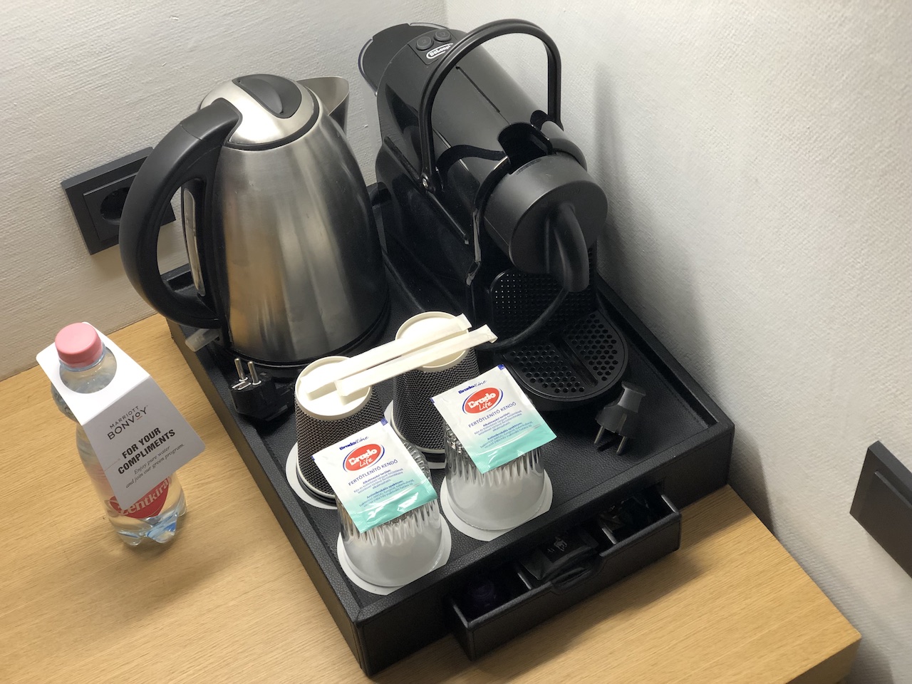 Mit Wasserkocher und Espressomaschine kann man sich mit Heißgetränken versorgen, Wasser und Kekse standen als kleine Aufmerksamkeit im Zimmer bereit.