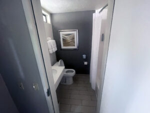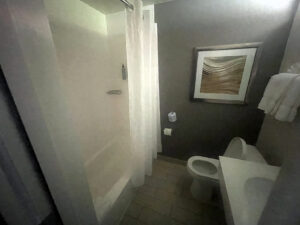 Man konnte sehr deutlich erkennen, dass es ursprünglich einmal zwei separate Zimmer waren, denn die beiden Zimmerhälften waren durch eine deckenhohe Wand getrennt. Lediglich vor dem Fenster gab es einen Durchgang. Außerdem waren die Zimmer (marriotttypisch) spiegelbildlich aufgebaut. Der Eingang zum Zimmer befand sich am Ende des Laubenganges. Im Eingangsbereich lag links das Bad, danach ging es in den Schlafbereich des Raums: Linkerhand zwei Queen Size Betten mit einem Nachttisch dazwischen. Gegenüber der Betten ein Fernseher, ein Lowboard/Schreibtisch mit Stuhl und ein Sessel mit Ottomanen. Durch den beschriebenen Durchgang ging es in den anderen Teil des Zimmers. Einziger Unterschied: Da wo auf der anderen Seite der Eingangsbereich war, befand sich eine Küchenzeile mit Spülbecken, Mikrowelle und Schränken mit Geschirr.