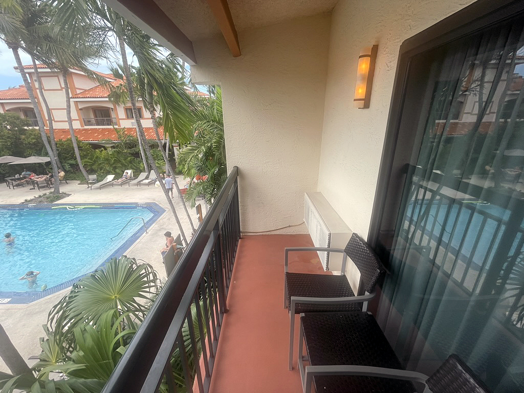 Von den Balkons, von denen wir auf den Pool blickten, gab es jeweils zwei Stühle und jeweils einen Beistelltisch und die fast obligatorischen Außenteile der Klimaanlage.