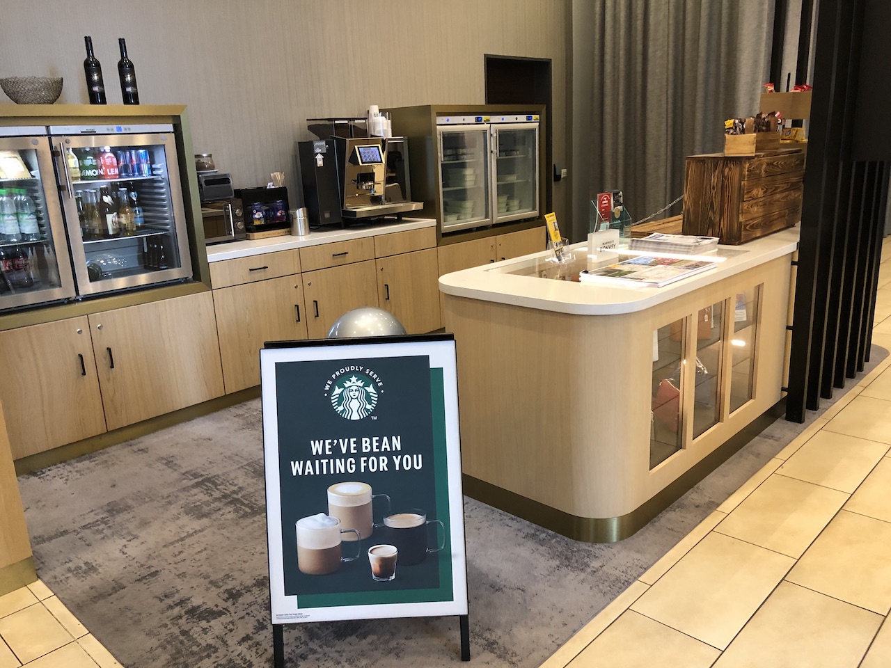 In der Lobby kann man sich neben der Rezeption in einem kleinen Markt bedienen und sich die leere Minibar bestücken, einen Kaffee holen oder kleine Snacks erwerben. In der Lobby stehen auch zahlreiche Sitzgelegenheiten zur Verfügung, das Ambiente war sogar ganz angenehm.