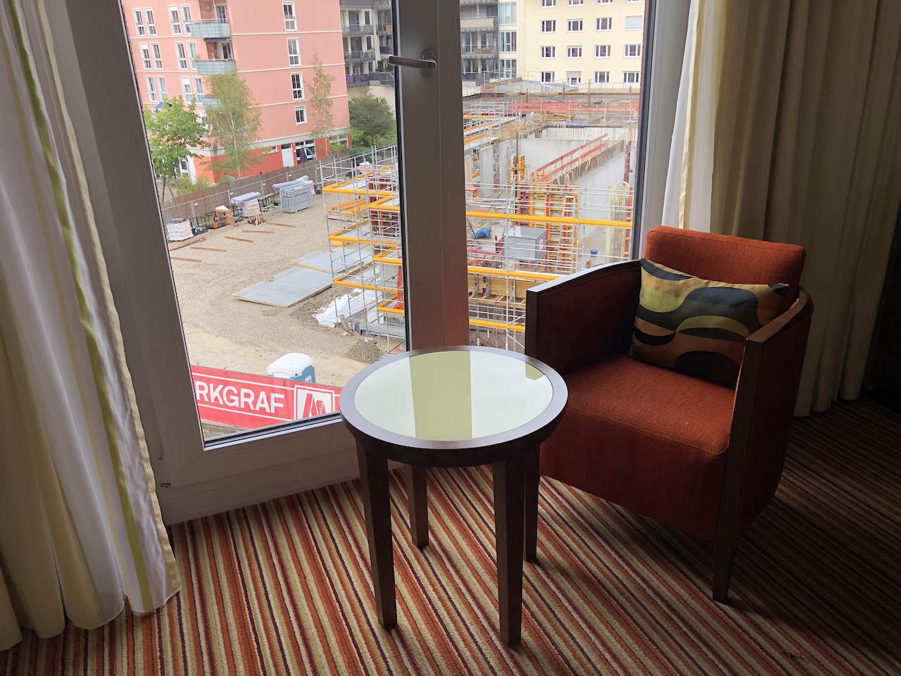 Der Raum hatte ein großes Fenster, im ersten Moment hätte man dahinter einen Balkon vermuten können. Der Ausblick war aber nicht gerade verlockend, durch die Baustelle ließen wir das Fenster ohnehin geschlossen.