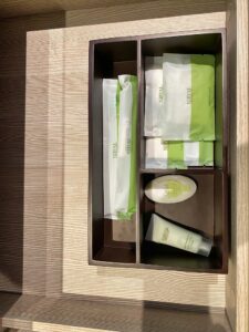 Die Seife etc. stammte von der aus langen Jahren bei Courtyards bekannten Serie Nirvae. Hervorragend war, dass dort ein kompletter Satz der Serie vorhanden war. Sonst bekommt man of nur Shampoo & Duschgel und ggf. Conditioner.
