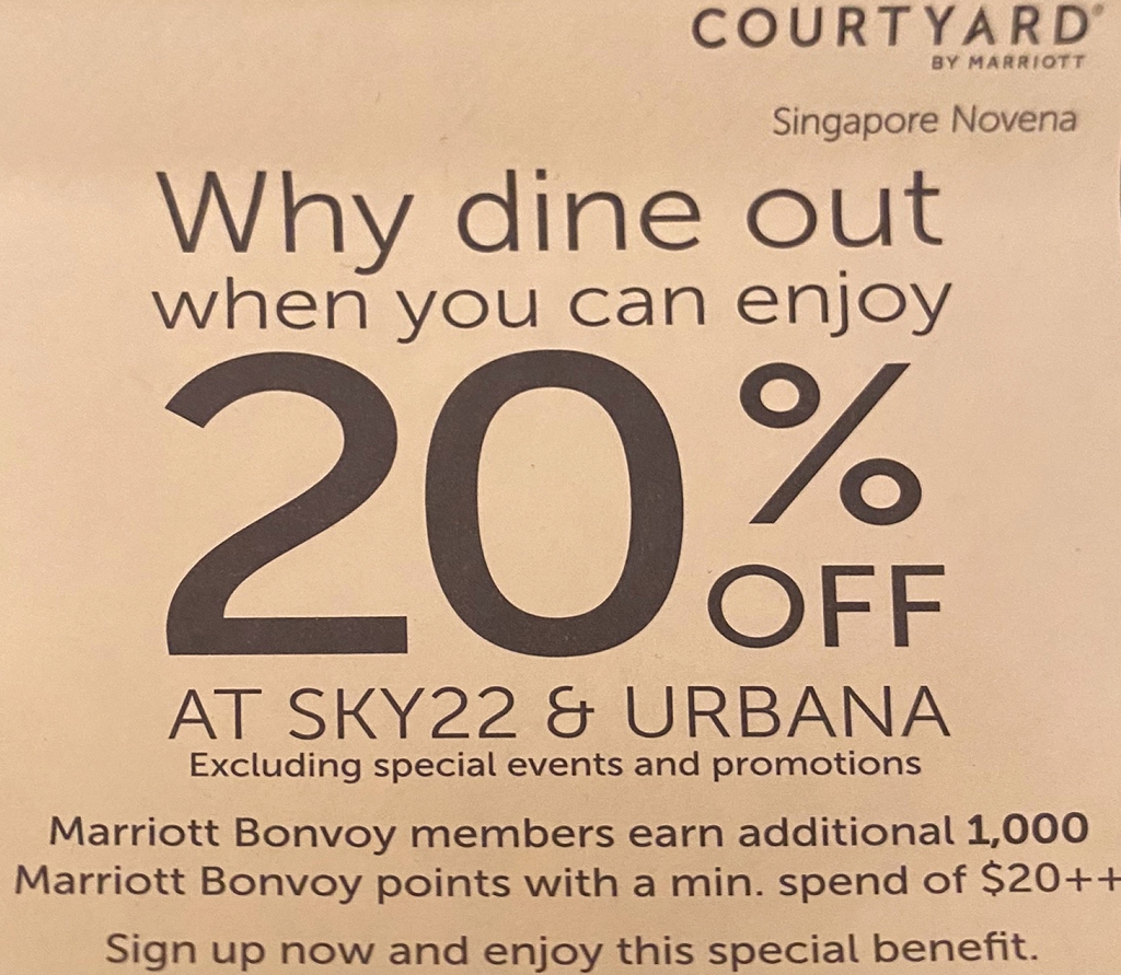 Als Mitglied von Marriott Bonvoy erhielt ich einen 20% Gutschein für die Urbana Bar und das Restaurant Sky22. Ganz attraktiv ist, dass man ab 20 SGD Ausgaben (vor Steuern) 1.000 Bonuspunkte bekommt. Natürlich kein Mega-Deal, aber insgesamt auch nicht schlecht.