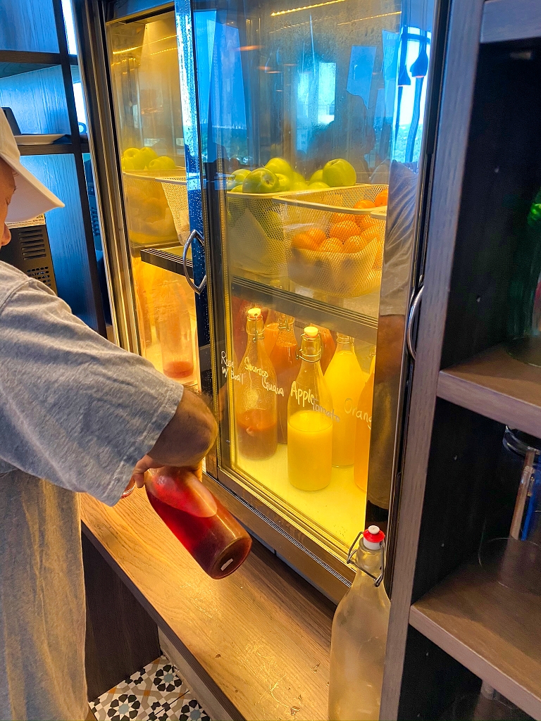 Obwohl es richtig voll war, waren Buffets und Getränkestationen immer gefüllt. Das Personal wuselte geradezu durch die Menge, um Nachschub heranzukarren. Die Auswahl war – gerade für ein Courtyard – überragend. Es gab verschiedene frische Säfte, frisches Obst/geschnittenes Obst, Cerealien, süßes Frühstück, herzhaftes Frühstück und obendrein noch eine Cooking-Station für warme Speisen. Die Wartezeit an der Cooking Station war in Ordnung und das Buffet machte die ganze Zeit einen frischen Eindruck. Auch geschmacklich war das Frühstück ansprechend und wirkte nicht irgendwie kostenoptimiert billig. Neben z.B. den „Standardobstsorten“ Äpfeln und Orangen/Mandarinen gab es auch eine große Auswahl regionaler tropischer Früchte.