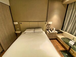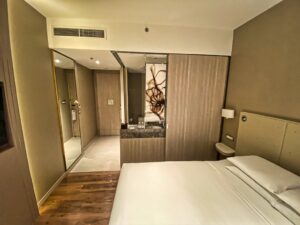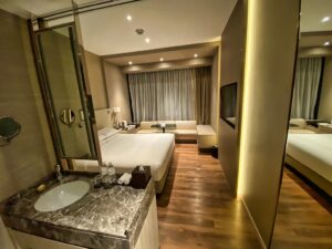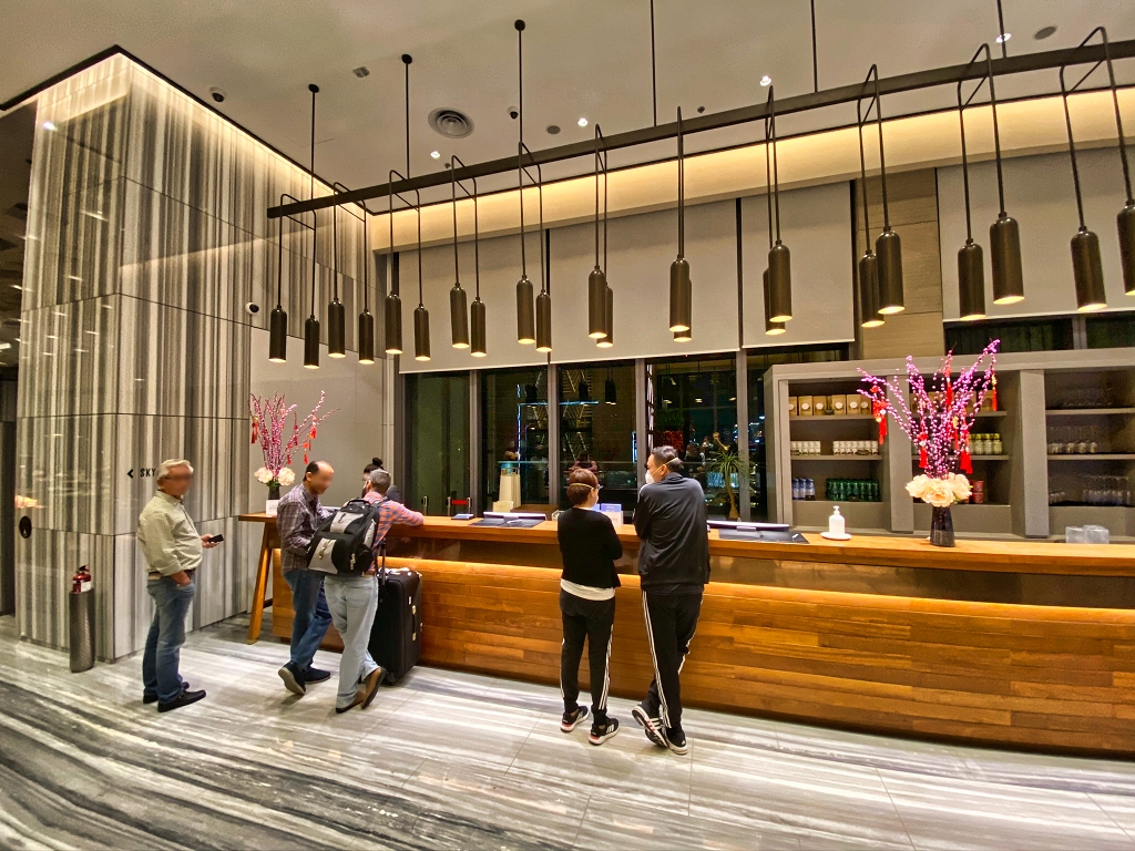 Mit dem Voucher vom Singapore Airlines Stopover Programm ging es dann an den Front Desk. Dieser befindet sich in direkter Nähe der Aufzüge, die einen in den 22. Stock bringen. Ich hatte die Buchung bereits in meinem Bonvoy Account hinterlegen lassen, so dass alle relevanten Informationen im Hotel vorlagen. Kurz den Voucher überreicht und eine Kreditkarte für die Minibar o.ä. hinterlegt und dann begann schon die Unterrichtung in Status Benefits und Hotel Amenities. Mir wurde auch angeboten, das Gepäck aufs Zimmer bringen zu lassen, was ich dann freundlich ablehnte.