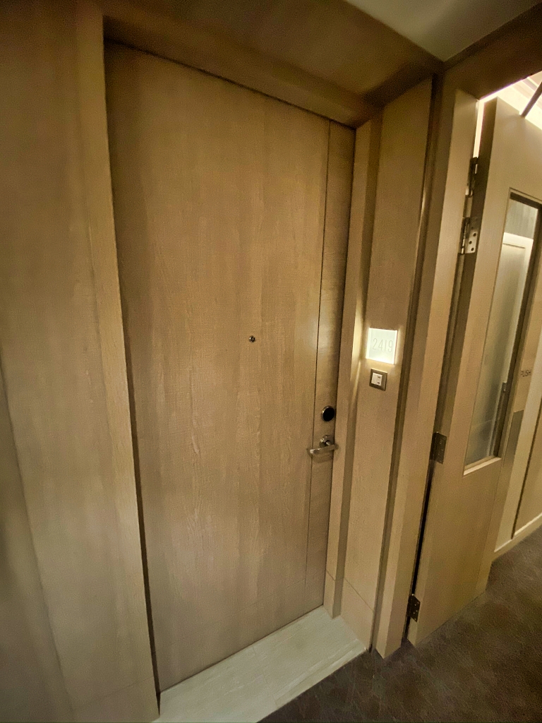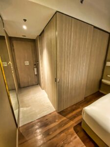 Das Zimmer war modern eingerichtet und hatte zeitgemäße Features, wie eine Ladebox für verschiedenste elektronische Geräte. Hinter der Tür begann der typische Gang, bei dem das Bad auf der einen und der Kleiderschrank auf der anderen Seite ist.