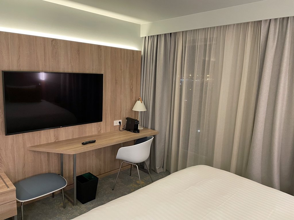 Gegenüber dem Bett befand sich der 50-55 Zoll große Fernseher, worunter sich der Schreibtisch befand. Auf dem Schreibtisch standen noch eine Kaffeemaschine und eine Lampe. Leider gab es keinen Schreibtischstuhl, sondern lediglich einen Sessel am Schreibtisch. Allerdings ist das Jammern auf hohem Niveau, immer mehr Hotels verzichten ganz auf Schreibtische.
