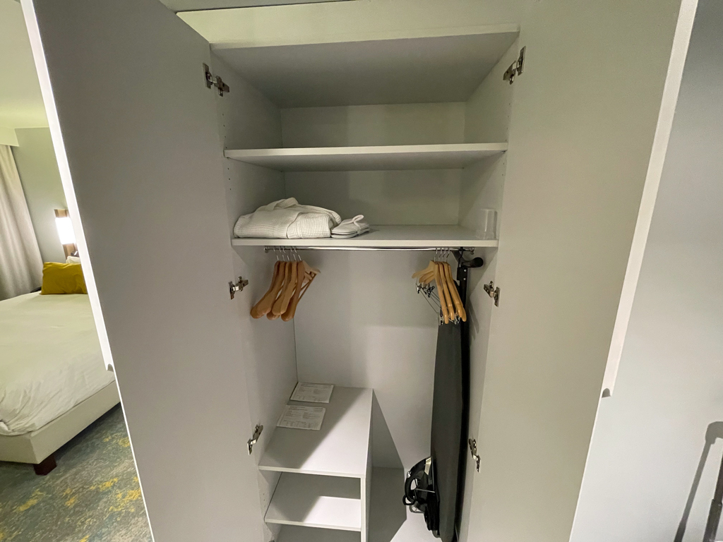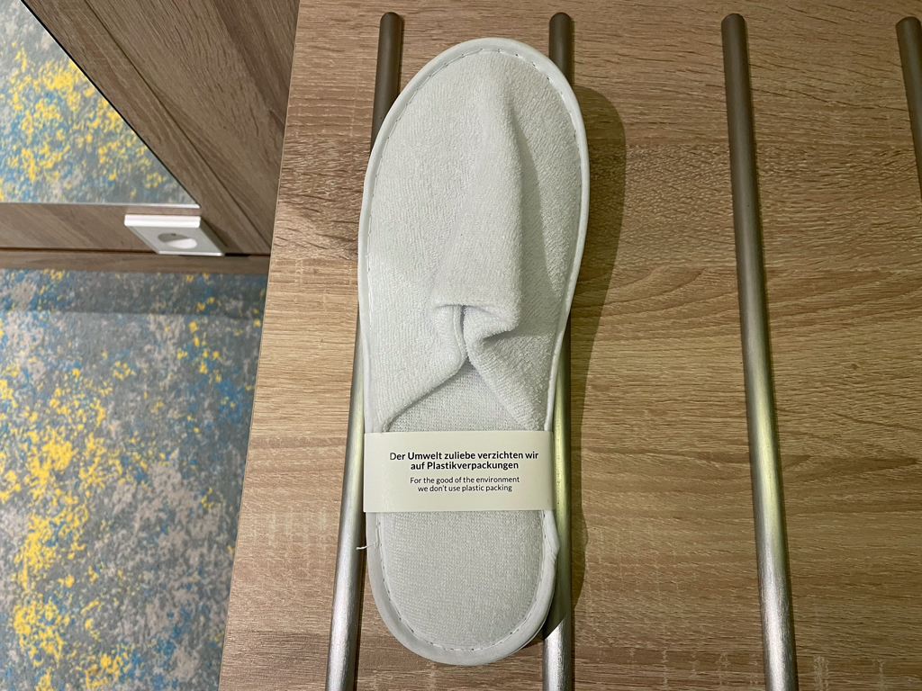 Im Eingangsbereich des Zimmers befand sich rechts der Kleiderschrank mit Bügeleisen und -brett sowie Bademantel und Schlappen. Die Schlappen waren anscheinend über Deutschland besorgt, denn der Hinweistext auf dem Siegel war auf Deutsch. Gegenüber dem Kleiderschrank befanden sich noch Haken an der Wand.