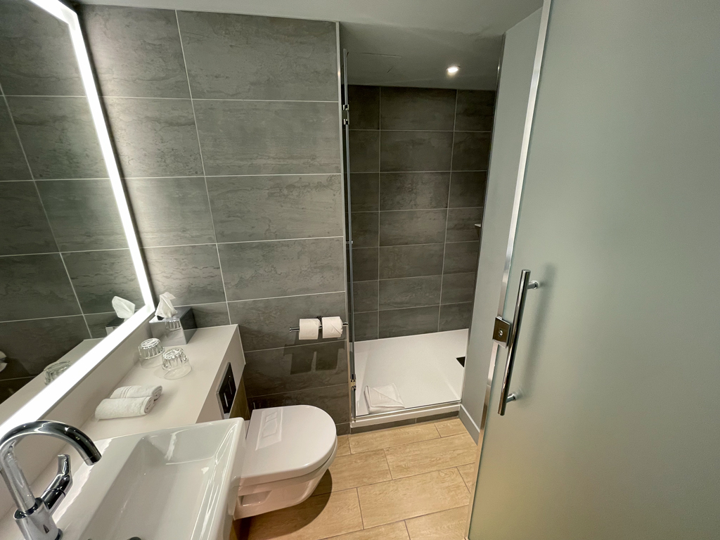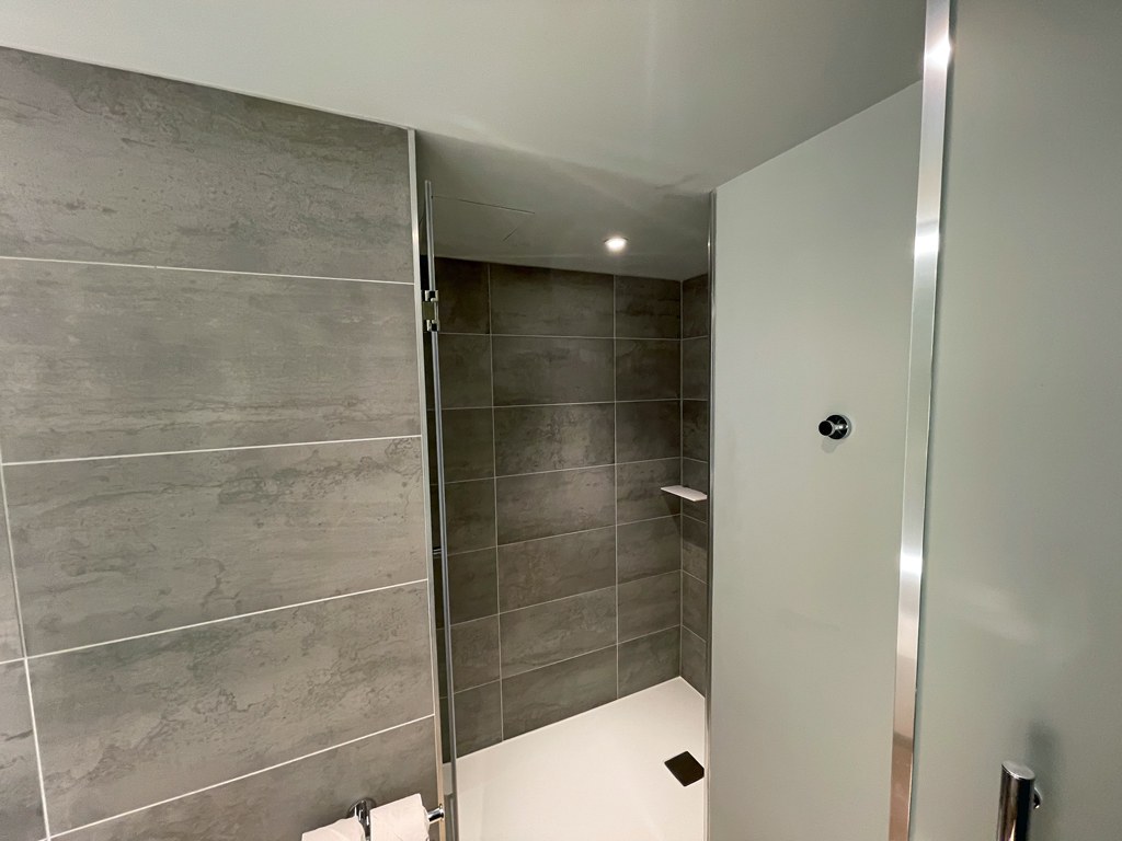 Das Bad wirkt modern, mit großen Fliesen und dem Hauptlicht, dass den großen Spiegel hinter dem Waschbecken rahmt. Die bodentiefe Dusche ist im hinteren Bereich des Bads „versteckt“. In der Dusche war der Wasserdruck in Ordnung und die Wassertemperatur gut zu regeln. Aus (nicht verschlossenen) großen Spenderflaschen konnte man dort Duschgel, Shampoo und Conditioner pumpen.