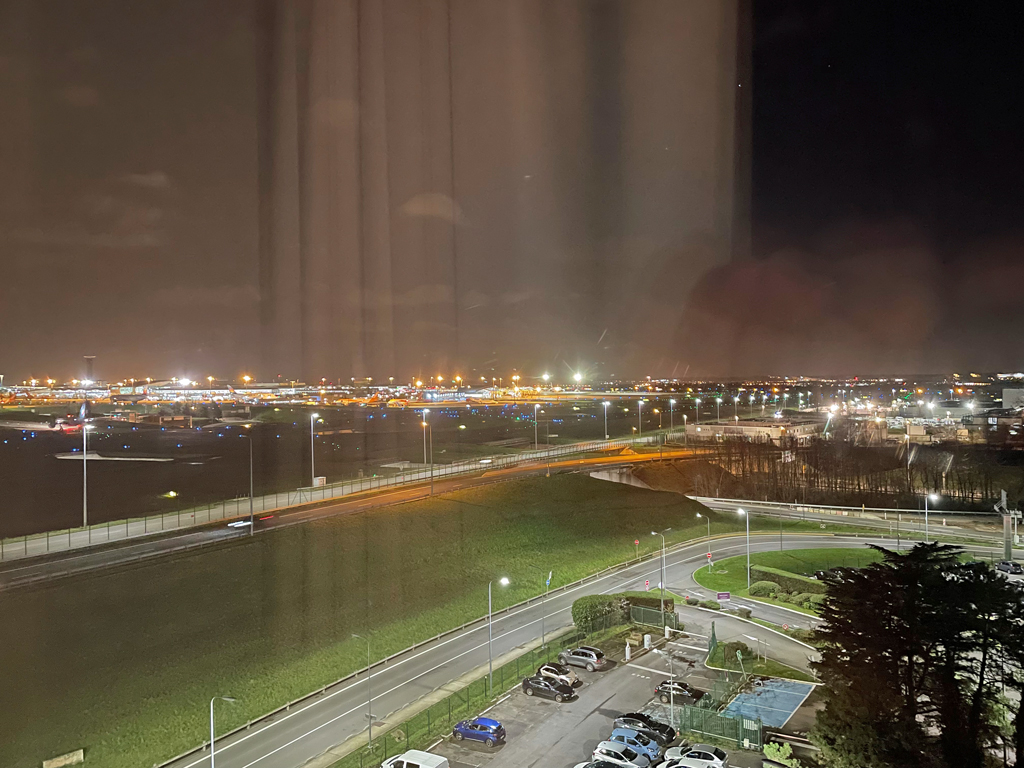 Mein Zimmer lag im 8. Stock und hatte Blick auf Teile der Taxiways am Flughafen. Auch nachts ist in Paris einiges los. Das konnte ich wenn ich am Fenster war sehen und wenn ich nicht am Fenster war – der fehlenden oder schlechten Schallisolierung sei’s gedankt – die ganze Nacht hören.