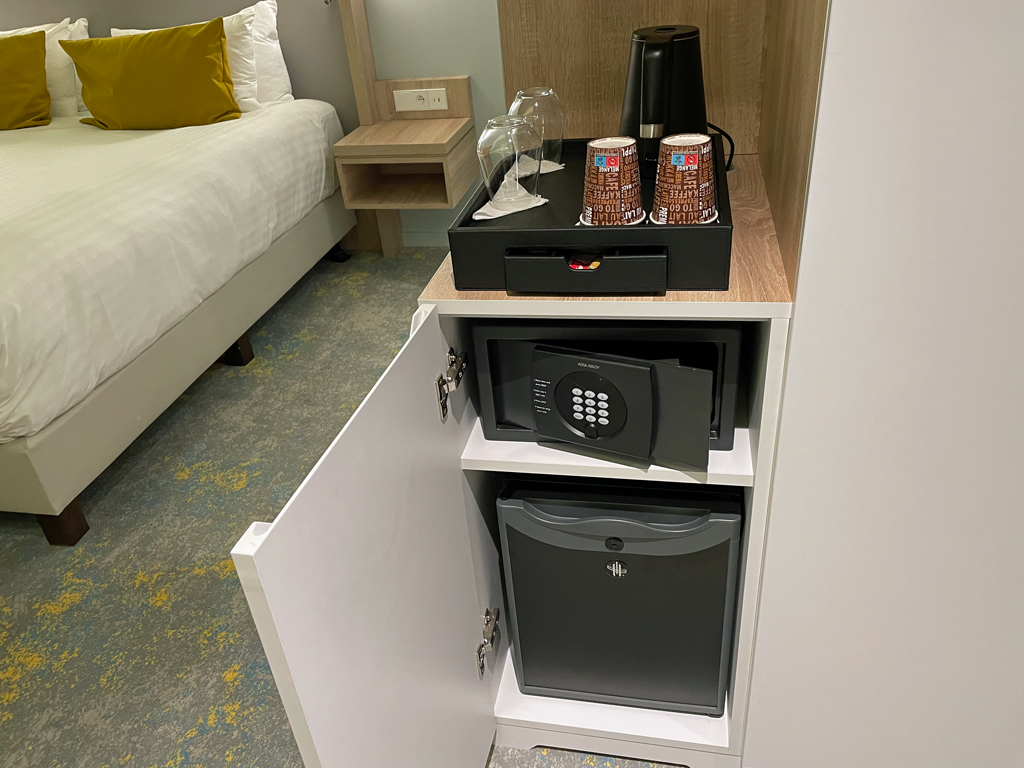 Nach dem Kleiderschrank ist ein Bar verbaut. Im unteren Schrankteil befinden sich ein leiser leerer Kühlschrank und ein Zimmersafe. Darüber befand sich auf dem frei zugänglichen Teil ein Wasserkocher mit To Go Kaffebechern und Gläsern. Für die Kaffeebereitung standen Instantkaffee und Zucker zur Verfügung.