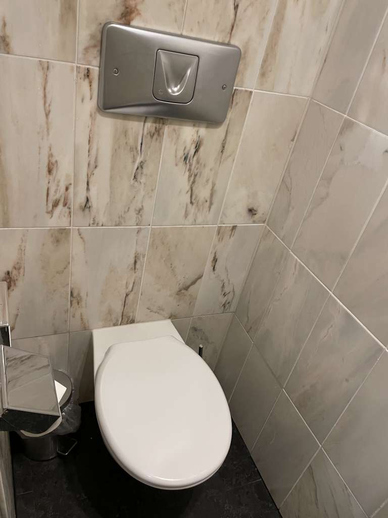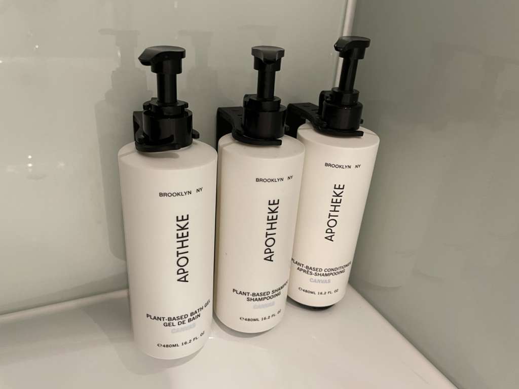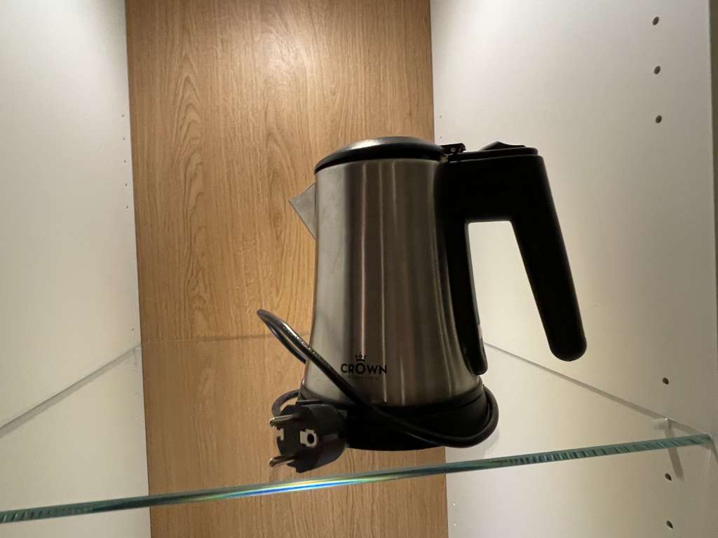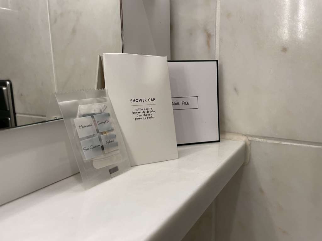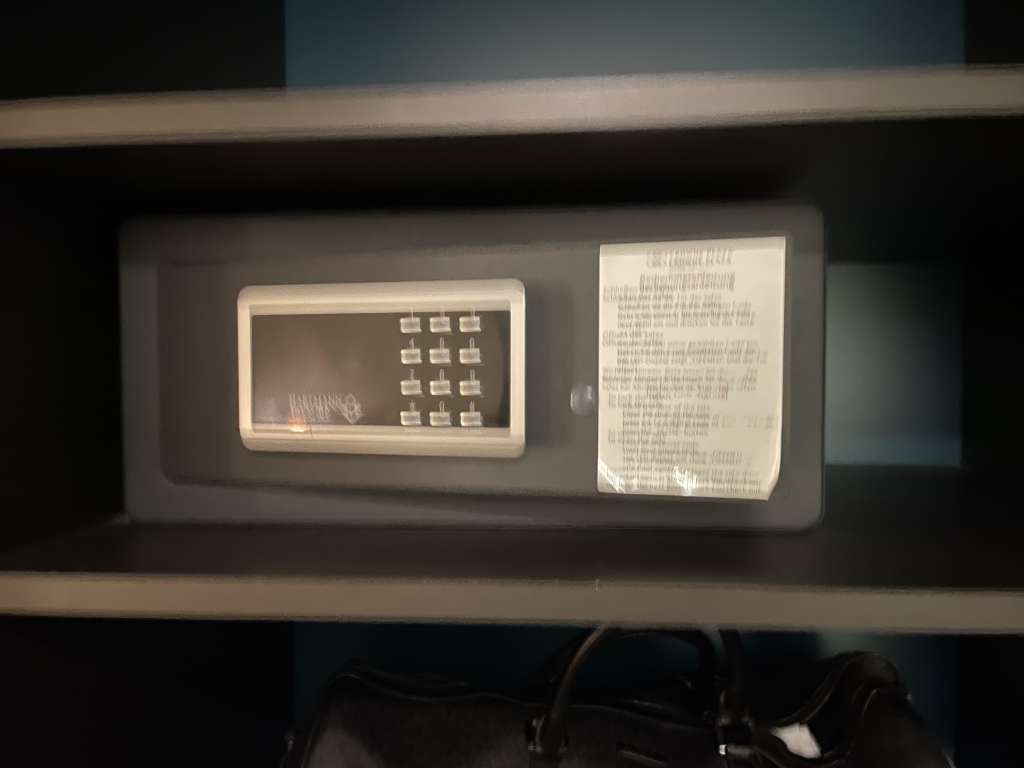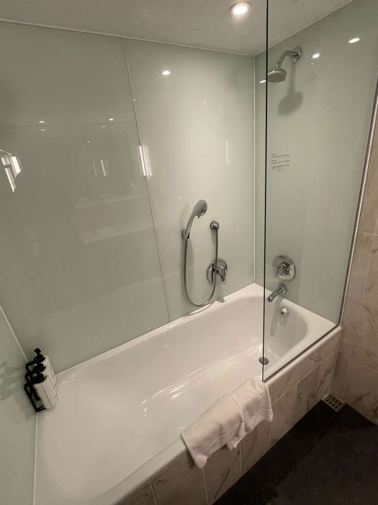 Zu den Features des Zimmers gehörten ein an der Wand montierter Bildschirm, ein separater Schreibtich, der obligatorische „cuck chair“, ein leerer Kühlschrank, Wasserkocher, Safe, Bügeleisen und Bügelbrett. Die im Zimmer beworbene Flasche Wasser befand sich nicht im Kühlschrank und musste ich an der Rezeption nachfordern. Genauso wie die Kaffeekapselmaschine. Irgendwann während des Aufenthalts fiel auf, dass es zwar Kaffeekapseln gibt, aber die dazugehörige Maschine fehlte. Das verdutzte auch den Mitarbeiter an der Rezeption, verpackte ich aber nett mit dem Hinweis, dass ich nur vermeiden wolle, später eine entwendete Kaffeemaschine auf der Rechnung zu haben.