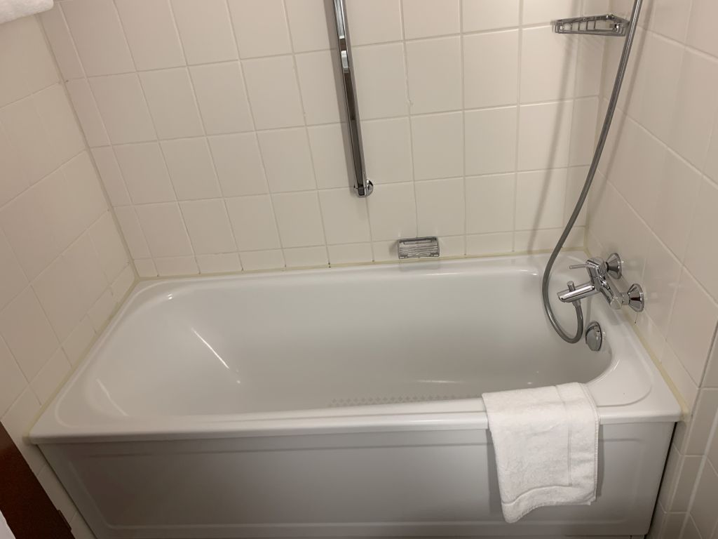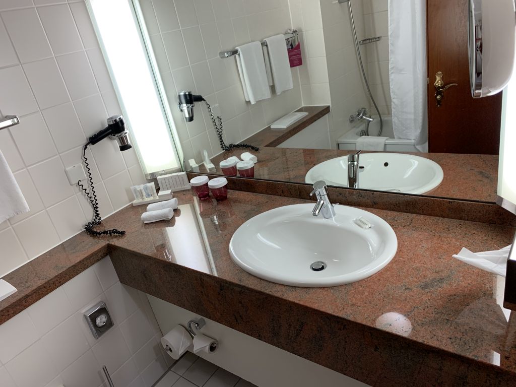 Von diesem kleinen Flur ging auch das Bad ab, welches zur Gesamtgröße des Zimmers passte. Es war ebenfalls recht klein und verfügte über eine Badewanne mit zusätzlicher Handbrause. Der Waschtisch war im typischen Crowne Plaza Marmor-Design gehalten, eine Toilette gab es natürlich auch.