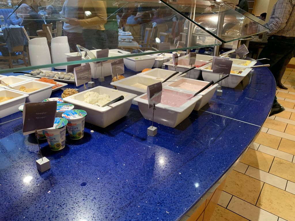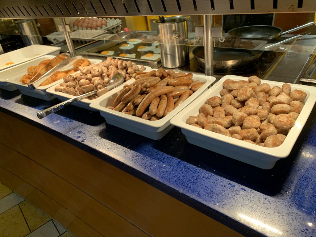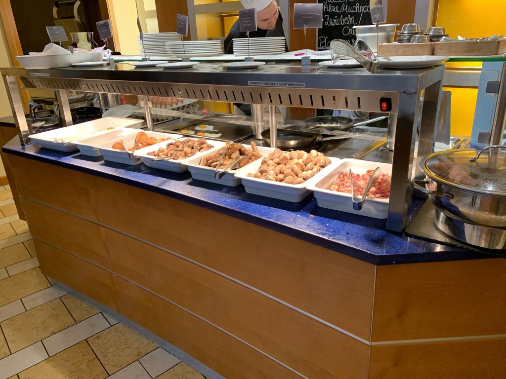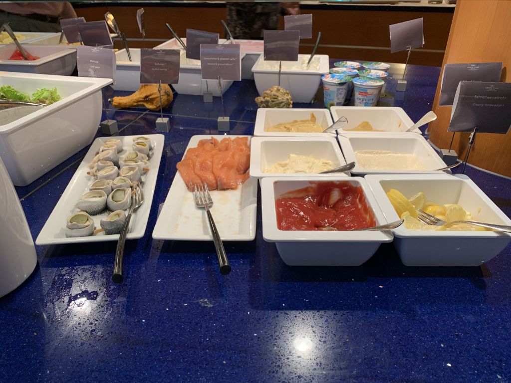 Die Auswahl beim Frühstück war völlig in Ordnung. Wer bei den warmen Optionen aus Würstchen, Frikadellen, Röstis und Champignons nicht fündig wurde, konnte noch auf Rührei, Speck und Bohnen ausweichen oder sich an der Live-Cooking-Station ein Omelette nach Wunsch zubereiten lassen. Ergänzt wurde das Frühstück um einige Wurst- und Käsesorten, Joghurts, Müsli und in etwa 20 Sorten Marmelade. Dazu gab es noch Lachs, Rollmops, Salat und Antipasti als Beilagen. Kaffee wurde uns aktiv am Tisch angeboten, konnten wir uns aber auch selbst an einem der Kaffeevollautomaten zubereiten.