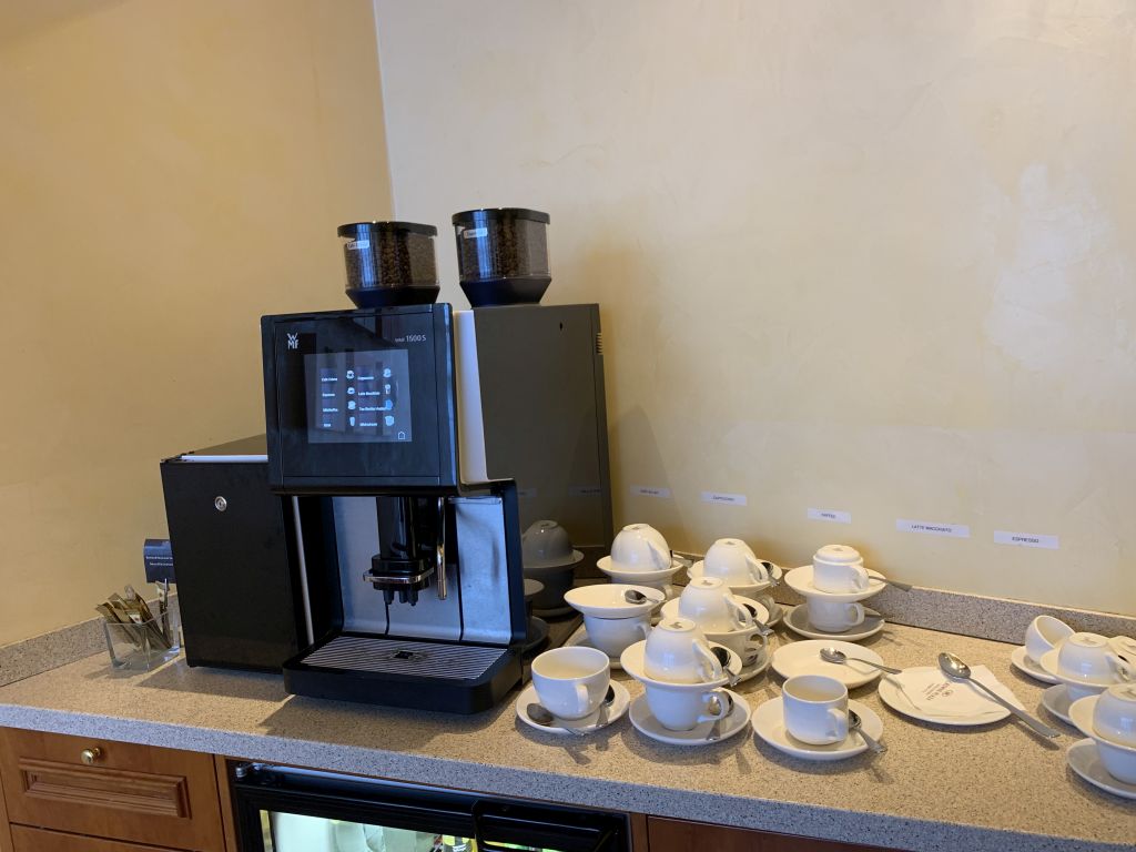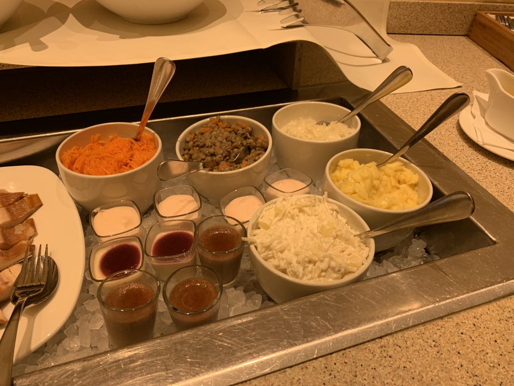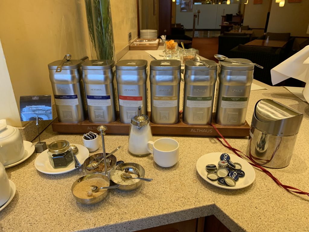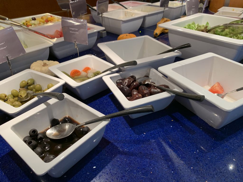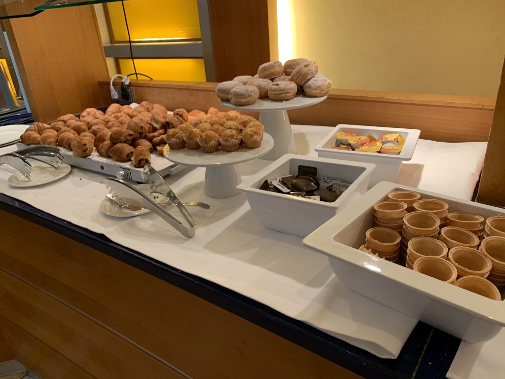 Die Auswahl beim Frühstück war völlig in Ordnung. Wer bei den warmen Optionen aus Würstchen, Frikadellen, Röstis und Champignons nicht fündig wurde, konnte noch auf Rührei, Speck und Bohnen ausweichen oder sich an der Live-Cooking-Station ein Omelette nach Wunsch zubereiten lassen. Ergänzt wurde das Frühstück um einige Wurst- und Käsesorten, Joghurts, Müsli und in etwa 20 Sorten Marmelade. Dazu gab es noch Lachs, Rollmops, Salat und Antipasti als Beilagen. Kaffee wurde uns aktiv am Tisch angeboten, konnten wir uns aber auch selbst an einem der Kaffeevollautomaten zubereiten.