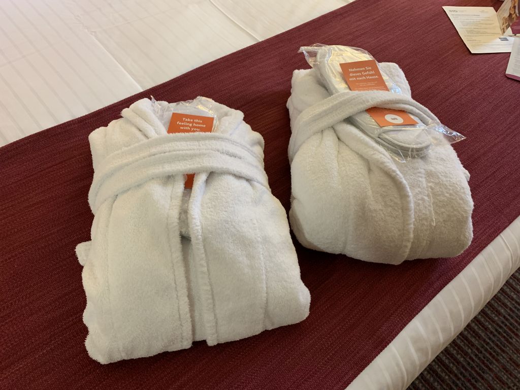 Auf einem kleinen Schrank, in dem auch die Minibar integriert war, stand eine Bosch Tassimo Kaffeemaschine. Zwei Flaschen Wasser hatte man uns zur Begrüßung auf die Nacht-Kommode gestellt und die Bademäntel inklusive Slipper lagen auf dem Bett bereit.