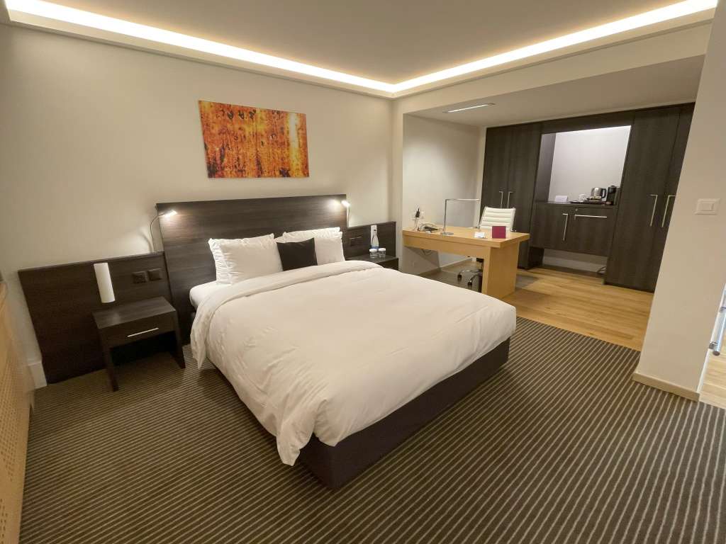 Großzügig und funktional ist die bereits teilweise renovierte Junior Suite eingerichtet. Zumindest das grau-braune Design der Applikationen, kombiniert mit den sonst hellen Holztönen, die eher typisch für die neuere Zimmergeneration bei Crowne Plaza sind, vermittelt diesen Eindruck. Die funktionale Einrichtung nutzt die Aufteilung des Raumes ideal aus. So verstecken sich in einer Ecke Loungesofa und Sessel als Wohnbereich mit an der Wand montiertem TV, während in einem anderen Teil des Zimmers der Schreibtisch direkt in Richtung des gemütlichen Queensize-Bettes gerichtet ist. Mehr als genügend Platz für das mitgebrachte Hab und Gut bieten die beiden Doppeltürenschränke, in denen sich auch ein Bügelbrett und Bügeleisen sowie flauschige Bademäntel mit Slippern befinden. Die unbefüllte Minibar, eine Kaffeemaschine und der Wasserkocher finden in oder auf einem weiteren Schrankelement dazwischen Platz. Neben dem Bett sorgen Leselampen, Nachttische und Steckdosen mitsamt USB-Anschlüssen für den nötigen Komfort. Über die komplette Länge der Junior Suite sorgen Fenster für mehr als genug Tageslicht und damit eine angenehme Helligkeit.