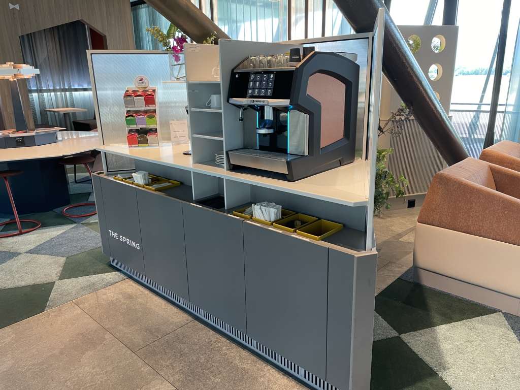 Ein ähnliches Bild gab die Getränkeauswahl ab. Kaffeespezialitäten gibt es aus dem Getränkevollautomaten, Tees stehen neben dem Wasserspender und allerlei Softdrinks, wie auch Wein und Bier, gibt es an dem kleinen Büfett, an dem auch die Speisen gereicht werden. Wer einen Gin Tonic oder anderen harten Alkohol möchte, muss sich an das Personal wenden. Das verhindert, dass Passagiere vor dem Flug stark angetrunken sind… ist aber vermutlich auch deutlich günstiger.