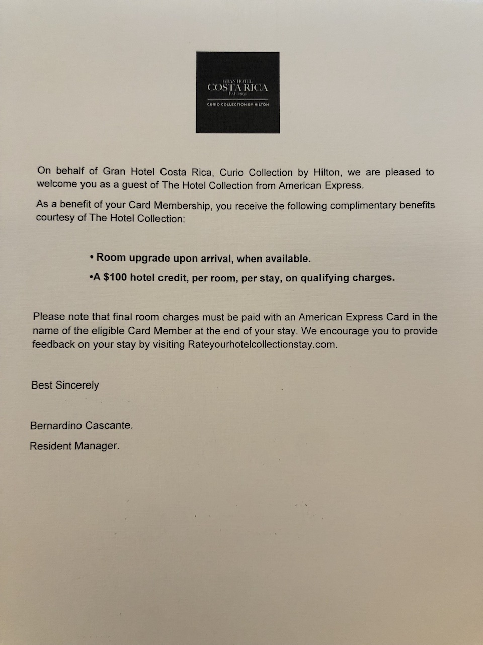Gebucht habe ich das Hotel bei American Express- Platinum Kunden können dort diverse Hotels mit zusätzlichen Vorteilen buchen (The Hotel Collection). Dazu gehört auch das Gran Hotel Costa Rica. Reisende, die eine Reservierung von mindestens 2 Nächten vornehmen, erhalten eine Gutschrift von 100 US$ und ein Upgrade. Der Preis war in diesem Fall nur minimal höher als bei einer Direktbuchung bei Hilton.
