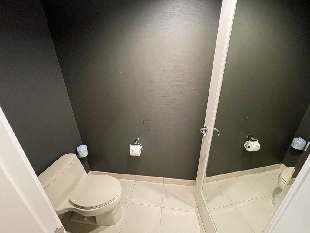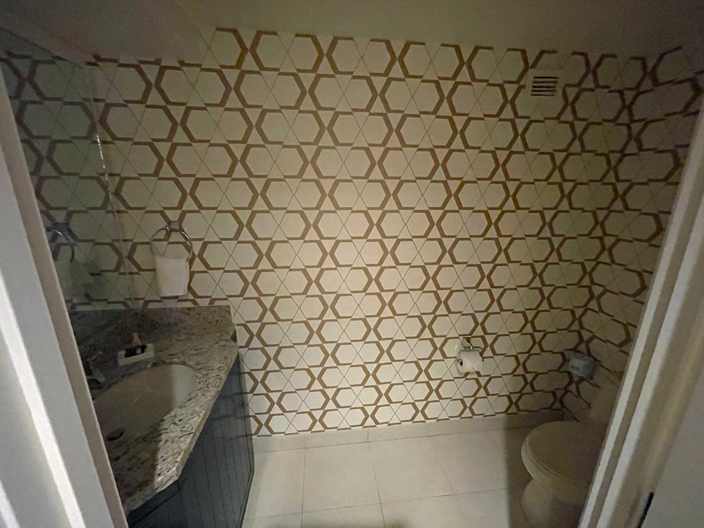 Das Hauptbad erreicht man über das Schlafzimmer. Es ist in Schwarz-Weiß gehalten. Es gibt am Waschtisch zwei Waschbecken und sogar einen Rasierspiegel. Leider waren an meinem das Licht defekt, was den Nutzen einschränkte. Neben der bodentiefen Dusche gibt es noch eine Badewanne. Das WC befindet sich in einem Nebenraum mit schwarzer Tapete, wodurch der kleine Raum sehr dunkel und eng wirkt. Eine Smartphoneablage gibt es in dem Raum nicht.