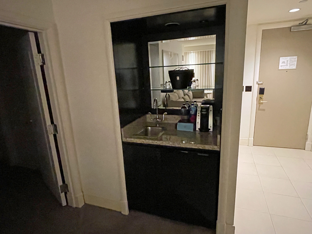 Bevor man durch eine Tür ins Schlafzimmer gelangt, passiert man noch einen kleinen Barbereich. Dort sind die Minibar, ein Spülbecken und ein Wasserkocher vorzufinden. Achtung bei der Öffnung des Kühlschranks oder bei der Berührung von Minibargegenständen, die oben sichtbar platziert sind: Alle sind mit Sensoren „gesichert“. Sobald ein Gegenstand bewegt wird, gilt er als konsumiert. Wer da auf Nummer sicher gehen möchte, kann der Kühlschrank an der Rezeption verriegeln lassen.
