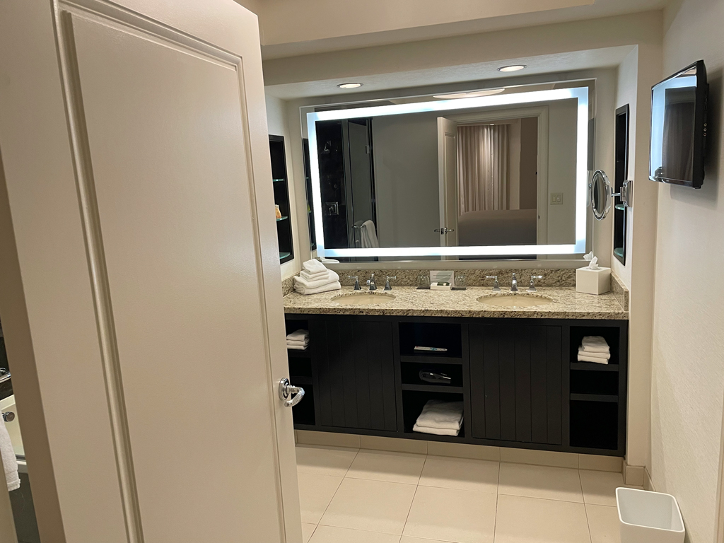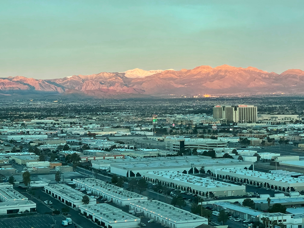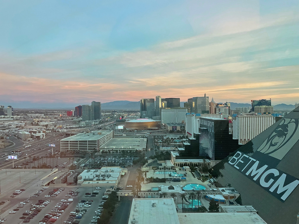 Beim Check-In erhielt ich ein Upgrade auf eine Scenic Suite. Diese liegen jeweils an den Enden der Gänge an den Stockwerken und bieten Ausblicke in zwei Richtungen. In eine Richtung blickte ich auf die Allegiant Arena, der Heimat der Las Vegas Raiders. Aus dem Schlafzimmer blickte ich in Richtung der T-Mobile Arena, dem Heimstadion der Las Vegas Golden Knights. Neben der T-Mobile Arena befindet sich das Kasinohotel Aria. Also hatte ich von meinem Zimmer keinen Blick auf den Strip mit den leuchtenden Kasinohotels.