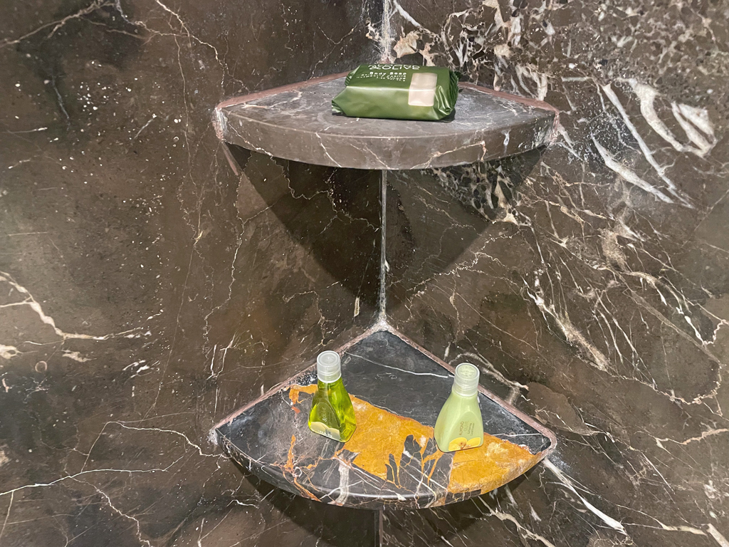 An Pflegeprodukten befinden sich Shampoo, Conditioner und Körperlotion in der Dusche sowie an den Waschbecken. Die Körperlotion ist aus meiner Sicht sogar sehr wichtig, denn statt Duschgel gibt es ein genoppten Seifenstück. Dabei handelt es sich eher um eine der klassischen Seifen, die einen die Hände bei Benutzung komplett austrocknen. Dieses Seifenstück ist auch zum Einseifen unter der Dusche gedacht. Mit ähnlichen Konsequenzen für die Haut. Das nur am Rande. Der Wasserdruck ist auf gutem Niveau und die Temperatur lässt sich einigermaßen punktgenau einstellen.