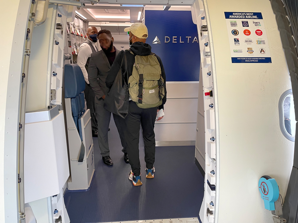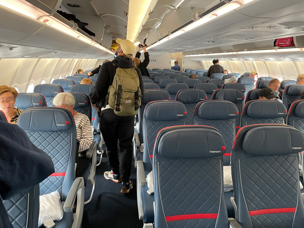 Das Boarding zog sich etwas hin, da es einen zusätzlichen Security Check im Flugzeug gab, der erst abgeschlossen werden musste, bevor Passagiere einsteigen durften. Aus irgendwelchen Gründen war auch noch „Attestation Day“ und Delta bestand darauf, dass alle Passagiere ihre CDC-Attestation ausfüllen und abgeben. Dementsprechend chaotisch ging es los.