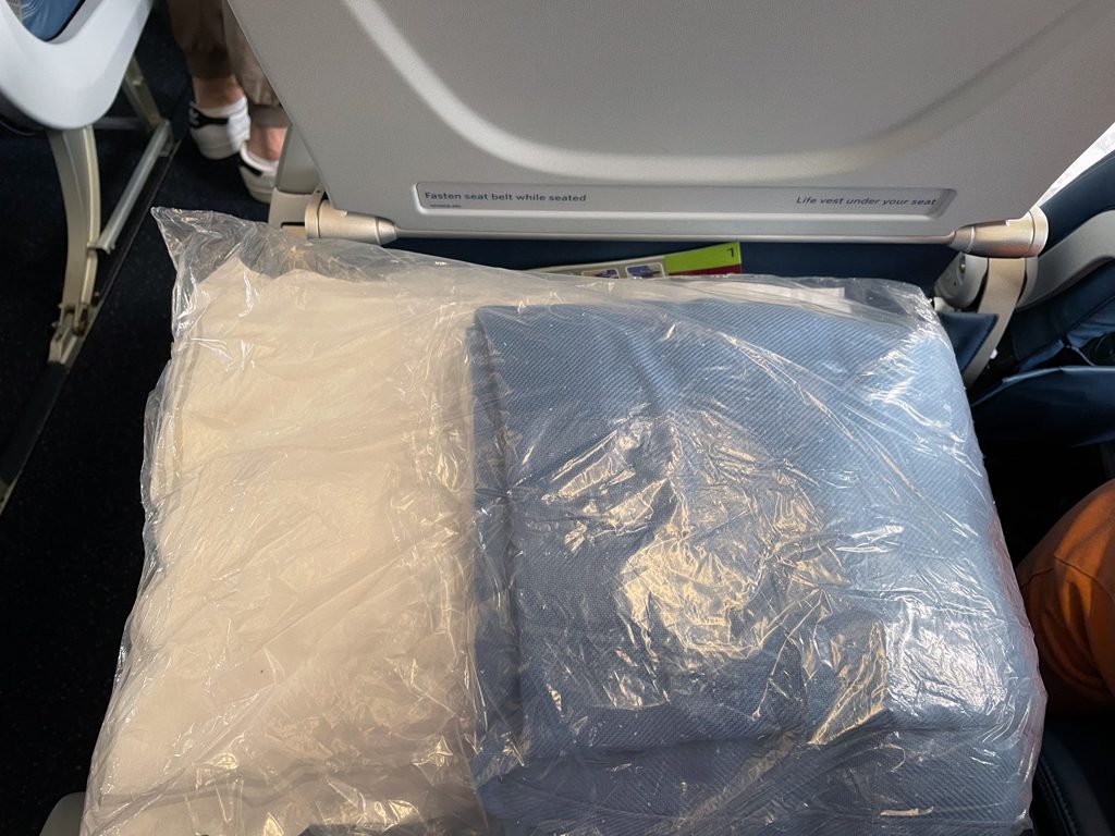 Außerdem erhalten Gäste bereits beim Einstieg am Platz einen Plastikbeutel mit Decke und Kissen. Die Decke hält warm und ggf. die Kleidung sauber, das Kissen macht das Sitzen bequemer.