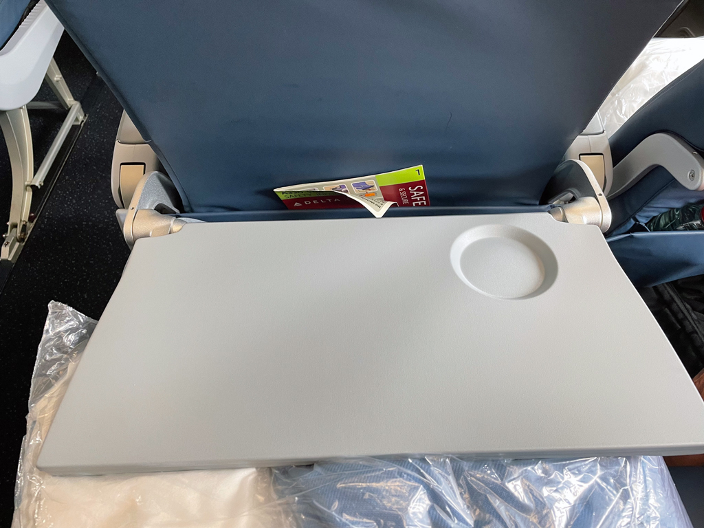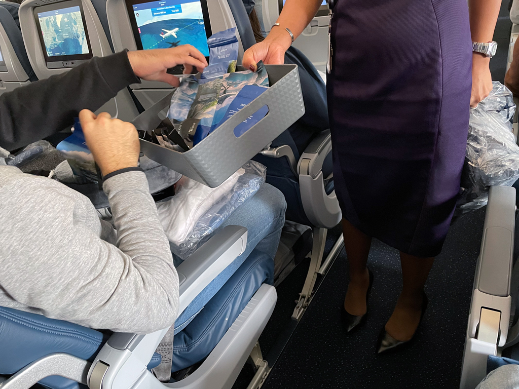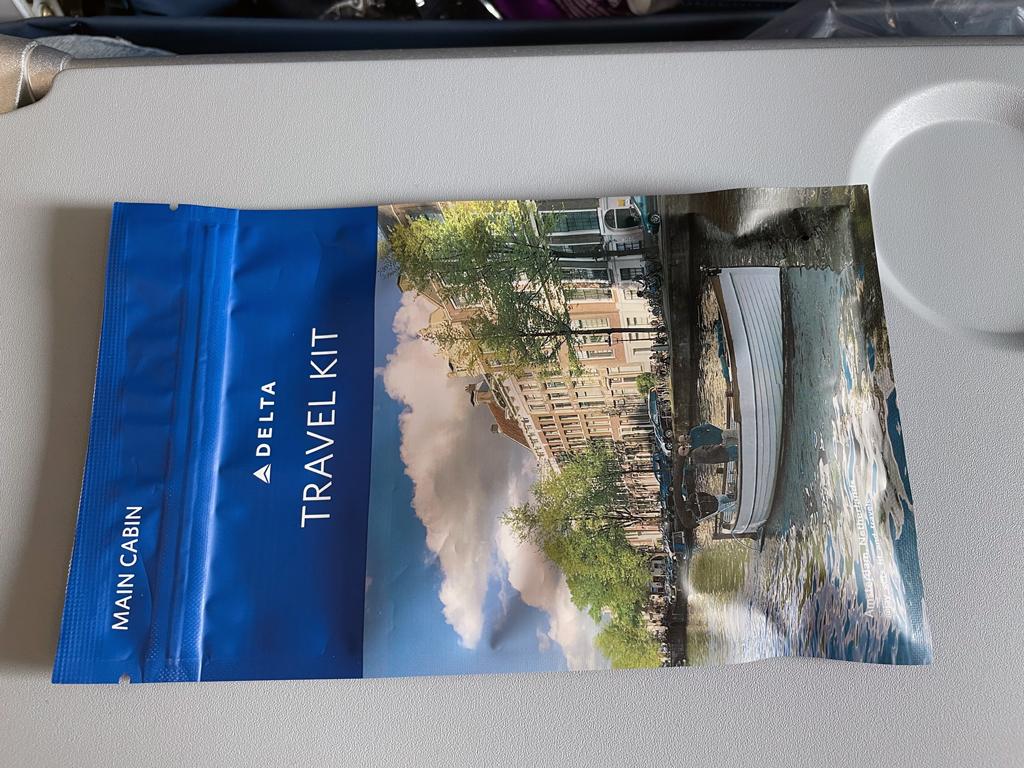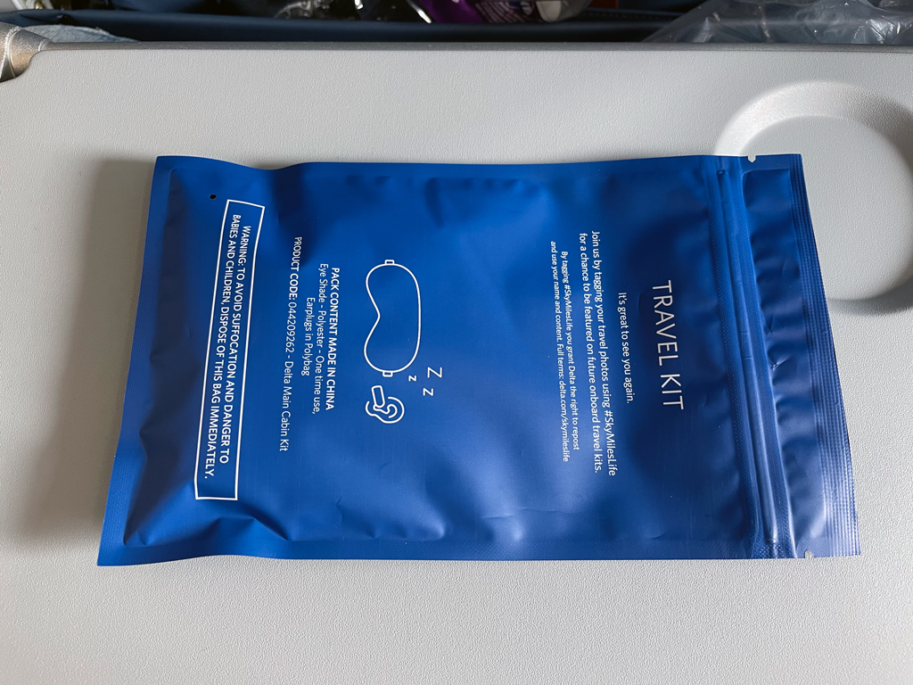 Delta ist eine der wenigen Fluggesellschaften, die auf der Langstrecke in der Economy Class ein Amenity Kit verteilen. Dieses besteht aus einer versiegelten Plastiktütchen mit einer Schlafmaske und Ohrenstöpseln.