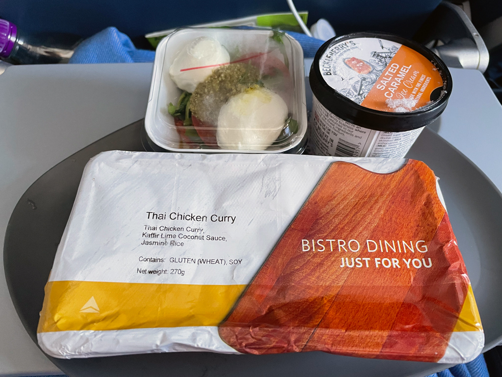 Circa 45 Minuten nach dem Start am Mittag begann der Service. Eine Ansage brachte den Passagieren die Essensoptionen näher (Chicken or Pasta). Bei den Getränken steht die „Full Bar“ zur Verfügung, d.h. dass auch alkoholische Getränke gratis ausgegeben werden. Allerdings wurde die Getränke erst zehn Minuten nach der Essensausgabe verteilt. Weitere 25 Minuten später gab es dann eine zweite Getränkerunde.