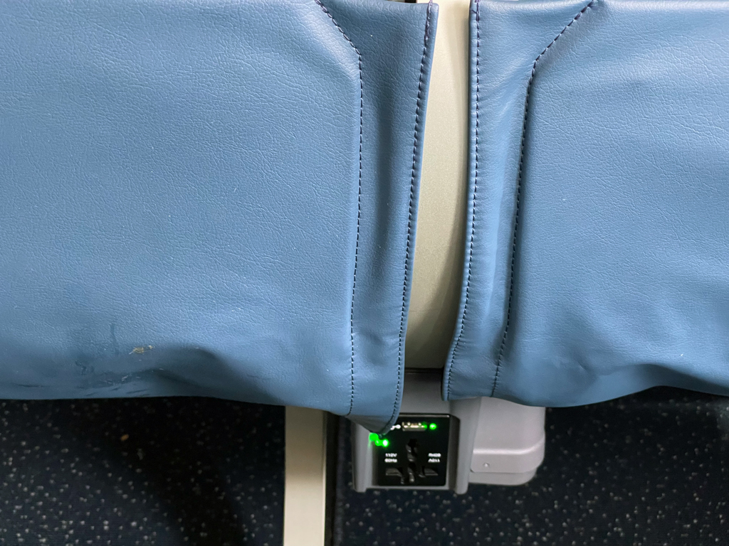 An der Bodenverankerung der vorderen Sitzreihe befindet sich eine Universalsteckdose, an der z.B. Notebooks oder größere elektrische Geräte laden lassen. Da es davon lediglich eine gibt, kann ggf. Kommunikation mit Mitreisenden notwendig werden.
