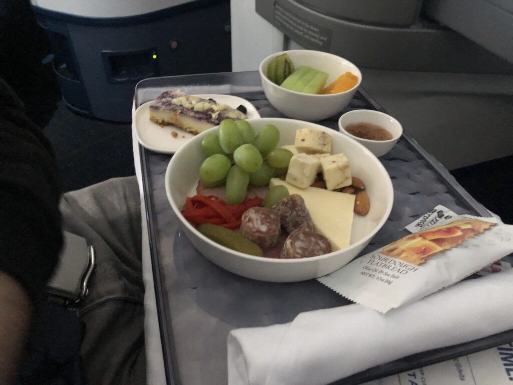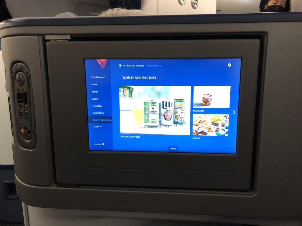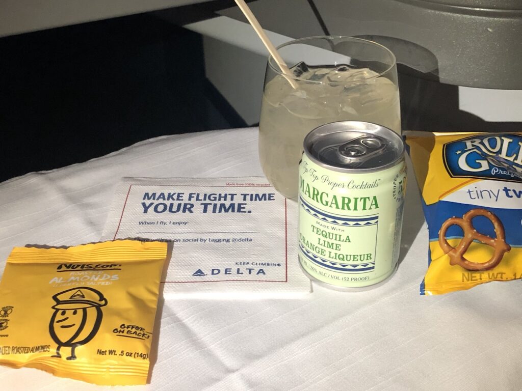 Einen Welcome Drink gab es nicht, es ging aber relativ kurz nach dem Start mit dem Service los. Delta bietet keinen Champagner, zumindest gab es auf allen Inlandsflügen nur Sekt. Cocktails wie Margarita oder Old Fashioned sind ebenfalls im Sortiment und kommen fertig gemixt aus der Dose. Ein Aperitif wurde vorab mit kleinen Salzbrezeln gereicht.