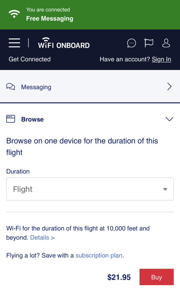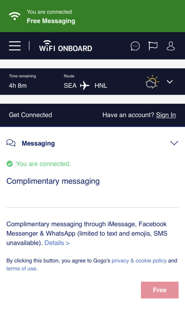 Passagiere können sich zwischen mehreren Wifi-Paketen entscheiden, Messaging ist kostenfrei und funktionierte ziemlich gut.