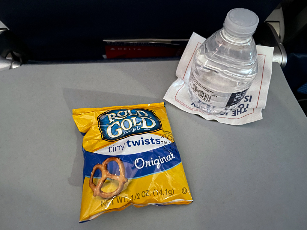 Obwohl der Flug mit 50 Minuten kurz war, hat Delta einen Getränke- und Snackservice angeboten. Es gab eine kleine Flasche Wasser und kleine Tüten mit Brezeln. Kein kulinarisches Highlight, aber eine gerngesehene Aufmerksamkeit.