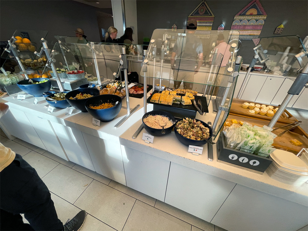 An dem Buffet gibt es eine reiche Auswahl an kalten und warmen Speisen. Neben Rohkost und Salaten gibt es belegte Backwaren (Brötchen sind es in den USA praktisch nie), Obst, Brötchen (!) zum Selbstbelegen inkl. Aufschnitt. Warme Speisen (3-4) gibt es an einem separaten Buffet.