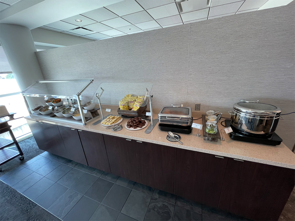 Das Buffet befindet sich in der Verlängerung der Bar und links an der Wand bevor man in den Gang zu den hinteren Räumen eintritt. Die Auswahl ist deutlich kleiner als in einem größeren Delta SkyClub wie in Atlanta. Statt drei warmen Speisen gab es hier nur eine. Auch die Auswahl an Snacks war weniger umfangreich. Das ist aber keine Überraschung, denn die Lounge ist wie gesagt klein und wird fast ausschließlich kurz vor 60 Minuten Flügen nach Atlanta genutzt.