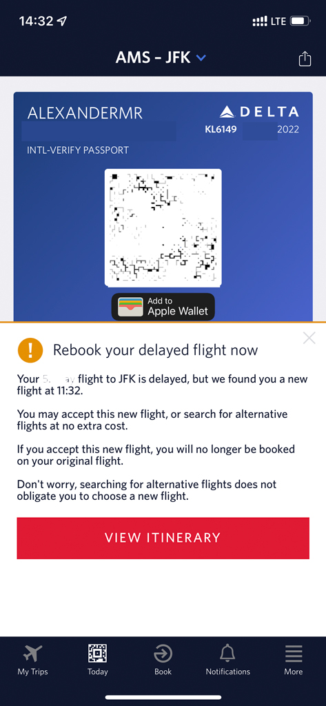 Also musste ich meinen Flug irgendwie umbuchen. Normalerweise geht eine solche Umbuchung bei Delta in der App recht gut. Allerdings hat die Verspätung in Amsterdam dazu geführt, dass die App davon ausging, dass ich dort bereits hätte umbuchen müssen und ließ mich nur den bereits absolvierten Transatlantikflug anpassen. Das ergab natürlich keinen Sinn und so war ich auf menschliche Hilfe angewiesen.
