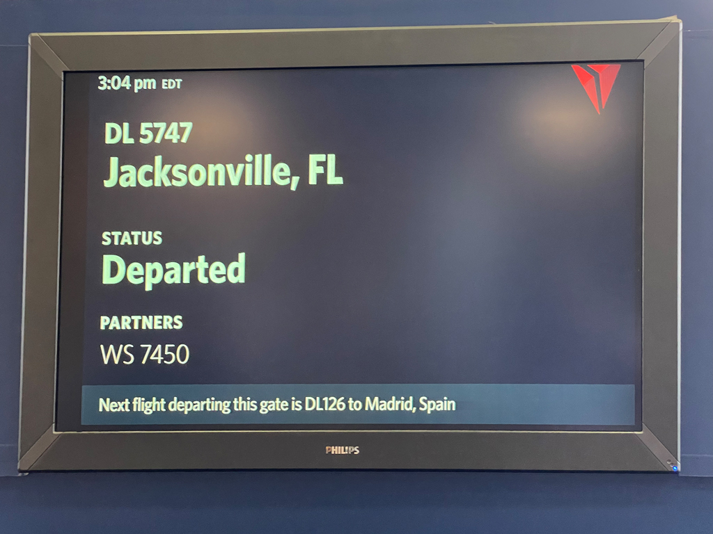 Und die Dame war echt auf zack. Erst hat sie mich auf den regulär nächsten verfügbaren Platz auf einem Flug um ca. 18:30 Uhr umgebucht. Dann kümmerte sie sich darum, mich möglichst schnell weiterzubefördern. Und es gelang ihr, mir den letzten Platz auf einem Flug um kurz nach 16 Uhr zu verschaffen. Sie forderte mich auf, schnell zum Gate im Terminal 4 zu gehen, während sie das Ticket finalisieren würde. Dort solle ich mich am Gate melden, wo dann alles final verarbeitet werden könne. Und so wurde mir dann am Gate das neue Ticket ausgestellt. In der neuen Domestic First von Delta. Denn das war der letzte verfügbare Platz im Flugzeug. Bravo Delta!