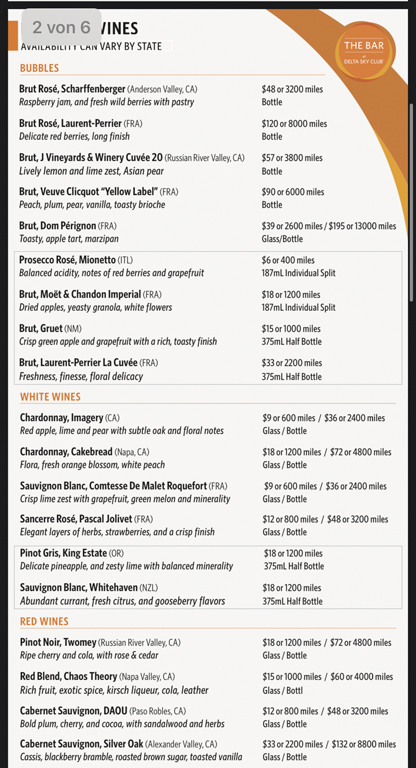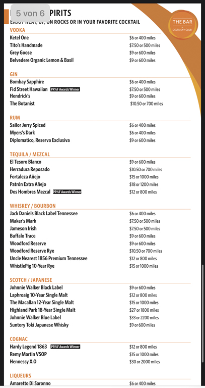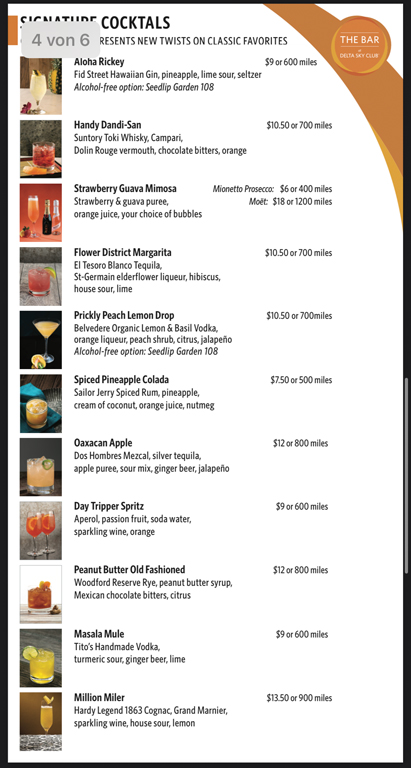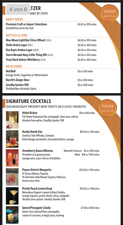 Und jetzt gibt es bei Delta die Bar, an der es Softdrinks, Bier, Wein und Cocktails gibt, die von Bartendern eingeschenkt und zubereitet werden. Eine große Anzahl der Getränke gibt es gratis, wer etwas Besonderes haben möchte, kann dafür mit Geld oder Meilen zahlen. Beim Einsatz von Skymiles hat man oft einen besseren Gegenwert als bei der Verwendung für Flüge.