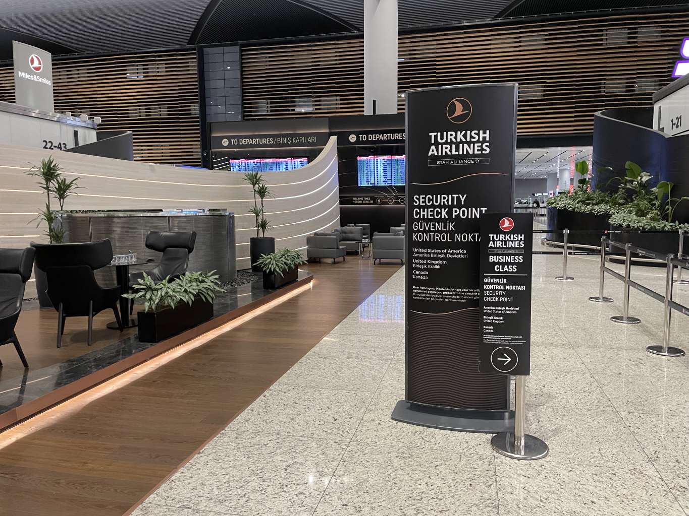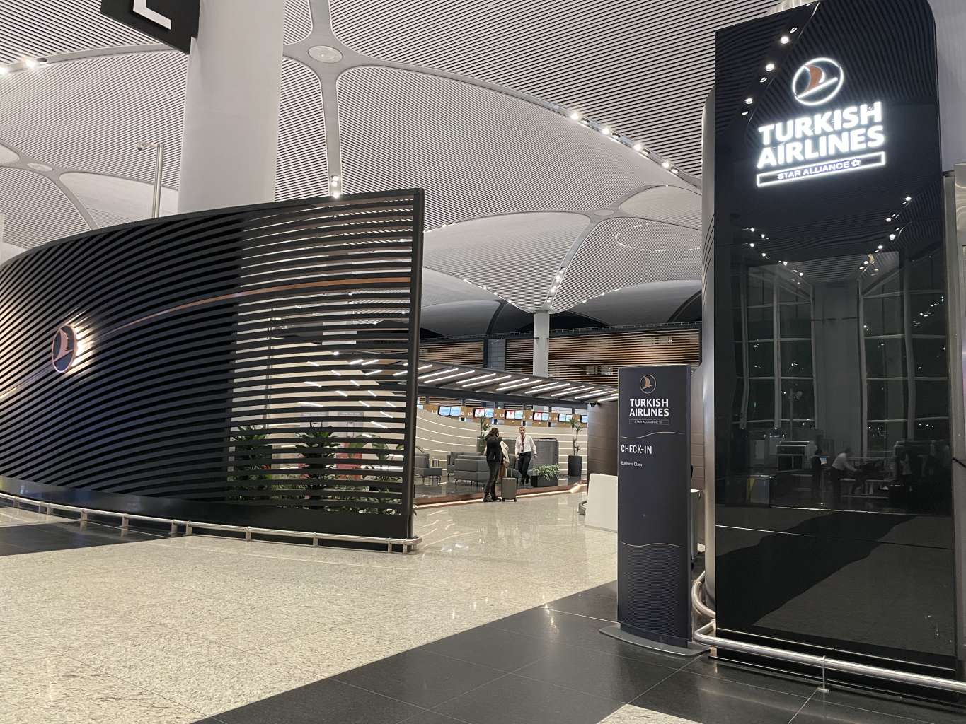 Turkish Airlines betreibt dort einen riesigen Check-In bestehend aus mehreren Reihen. Ein Teil davon ist ein exklusiver Check-In für die Business Class-Gäste von Turkish Airlines. Wie bei einem Zugang zu einem Vergnügungsviertel versperrte hier eine moderne Wand den Blick in den Turkish Airlines Business Class Check-In.
