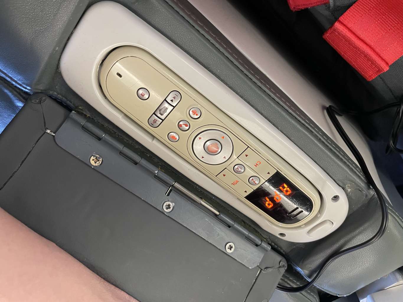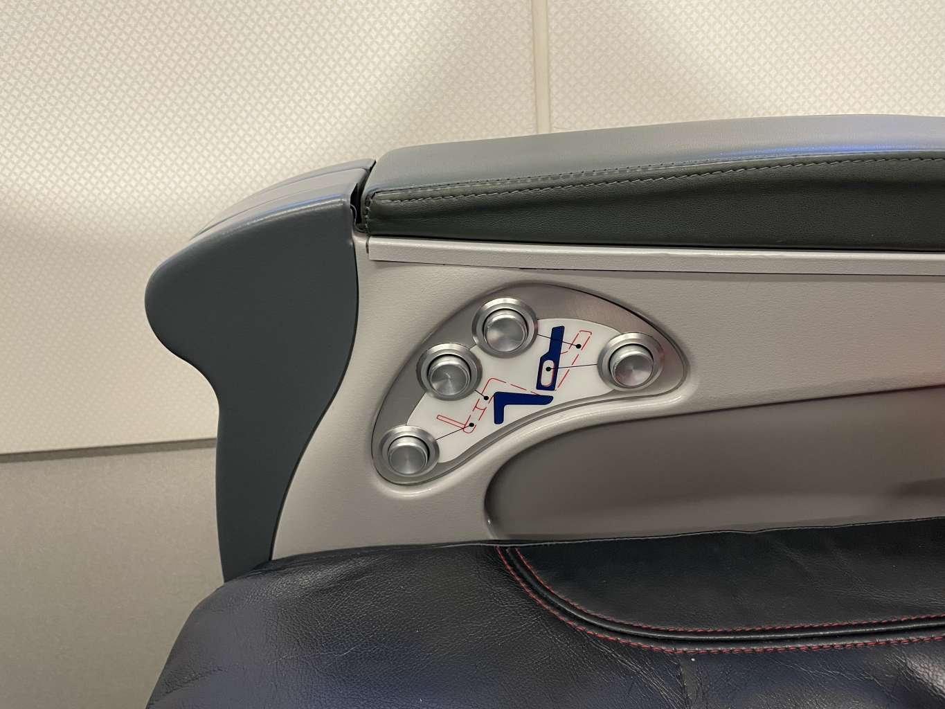 Die mechanische Sitzverstellung funktioniert über Knöpfe, die in der Seite der Armlehne eingebaut wurden. In einer der Armlehnen befindet sich die Fernbedienung des Inflight-Entertainment-Systems. Der dazu passende Bildschirm lässt sich ebenfalls aus der Armlehne ausfahren.