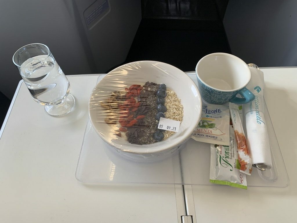 Nach dem Start in Frankfurt wurde auch direkt mit dem Service auf diesem 1:15 Stunden Flug begonnen. Da es ein Morgenflug war, wurde ein Frühstück serviert, auch hier wieder nach Air Dolomiti Standart. Die kalten Haferflocken mit Topping waren hier auch durchaus gut, auch wenn es ein sehr überschaubares Frühstück war. Brot oder Brötchen waren leider nicht an Bord.