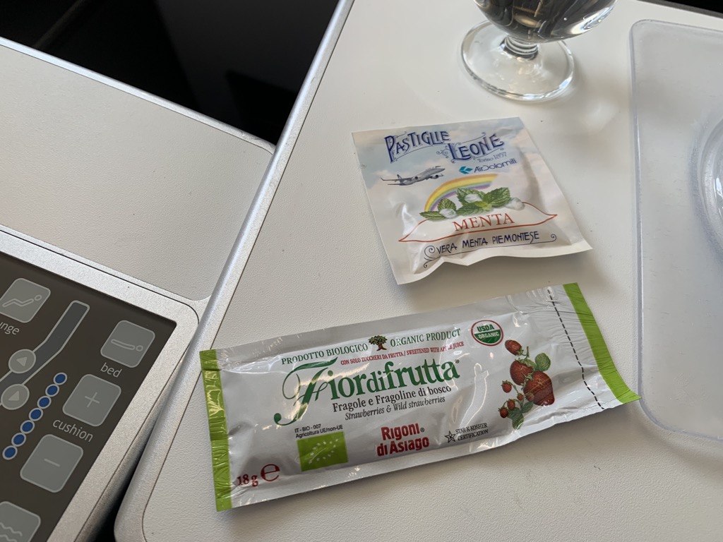 Schon kurz nachdem ich meinen Sitzplatz eingenommen hatte, wurde ich mit Namen begrüßt, mir wurde eine Flasche Wasser überreicht, sowie Italienische Süßigkeiten angeboten. Gerade auf Kurzstreckenflügen innerhalb Europas ist so etwas alles andere als üblich und die Crew hat dies bei allen Passagieren so durchgezogen.