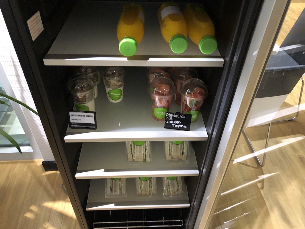 Mein Besuch fand unter der Woche gegen 6 Uhr morgens statt. In einem Kühlschrank waren abgepackte Sandwiches, Müsli, Obstsalat und frischer Orangensaft.