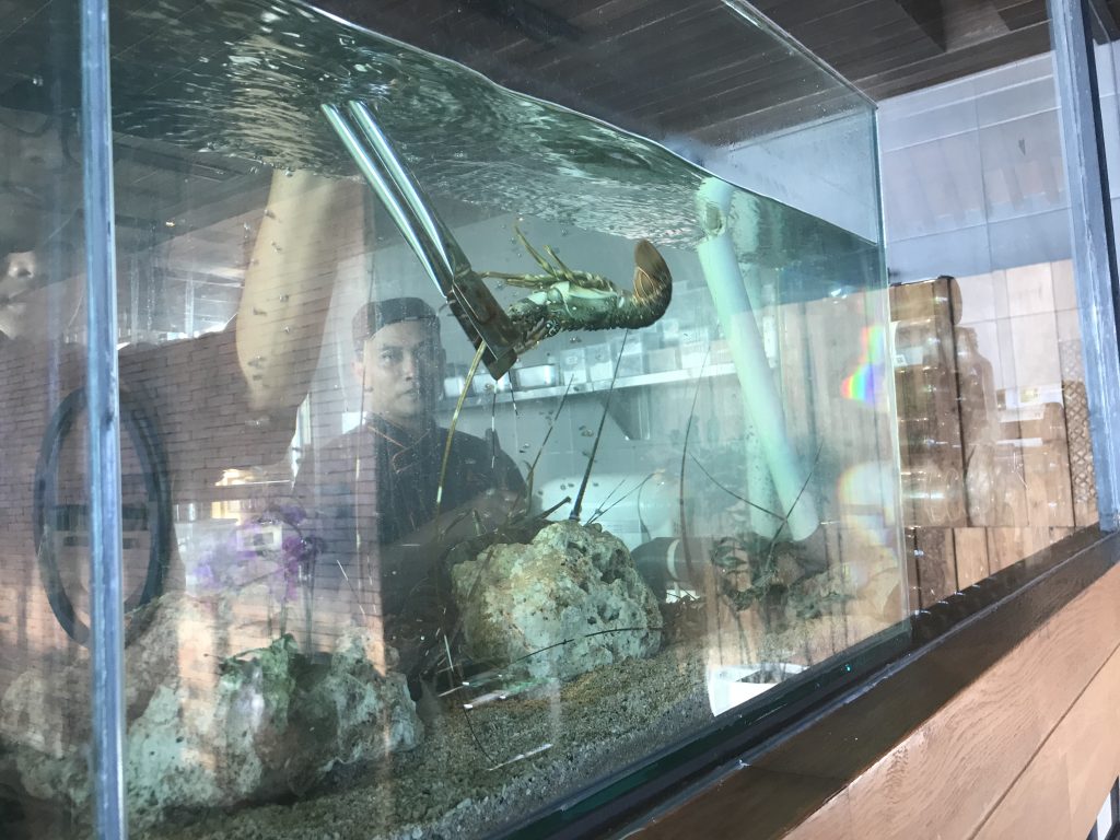 Christoph hat sich einen kleinen Hummer ausgesucht, der in seinem Beisein „geangelt“ wurde. Wir sind anschließend an unseren Platz zurückgekehrt und haben die Aussicht genossen, bis das fertige Hummergericht kam.